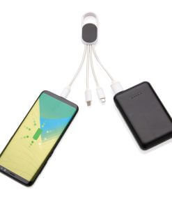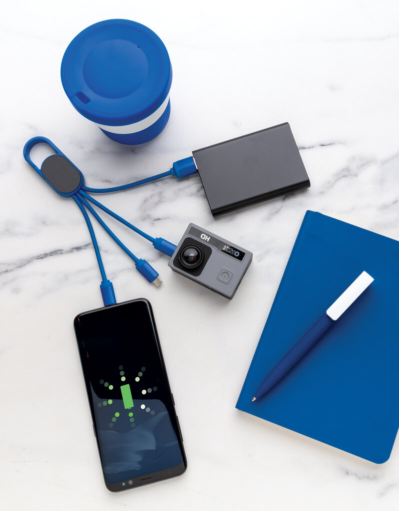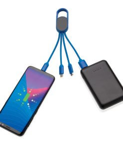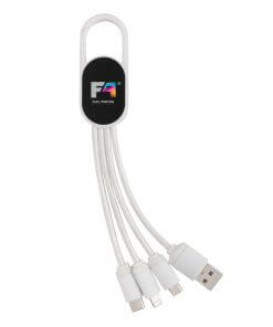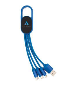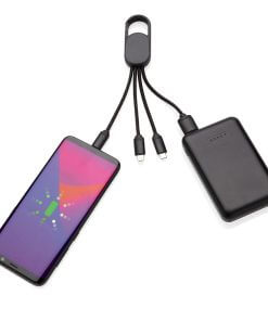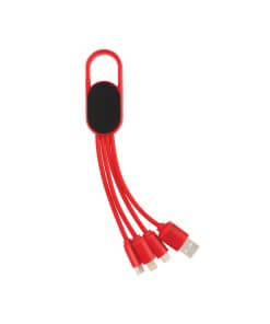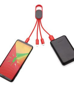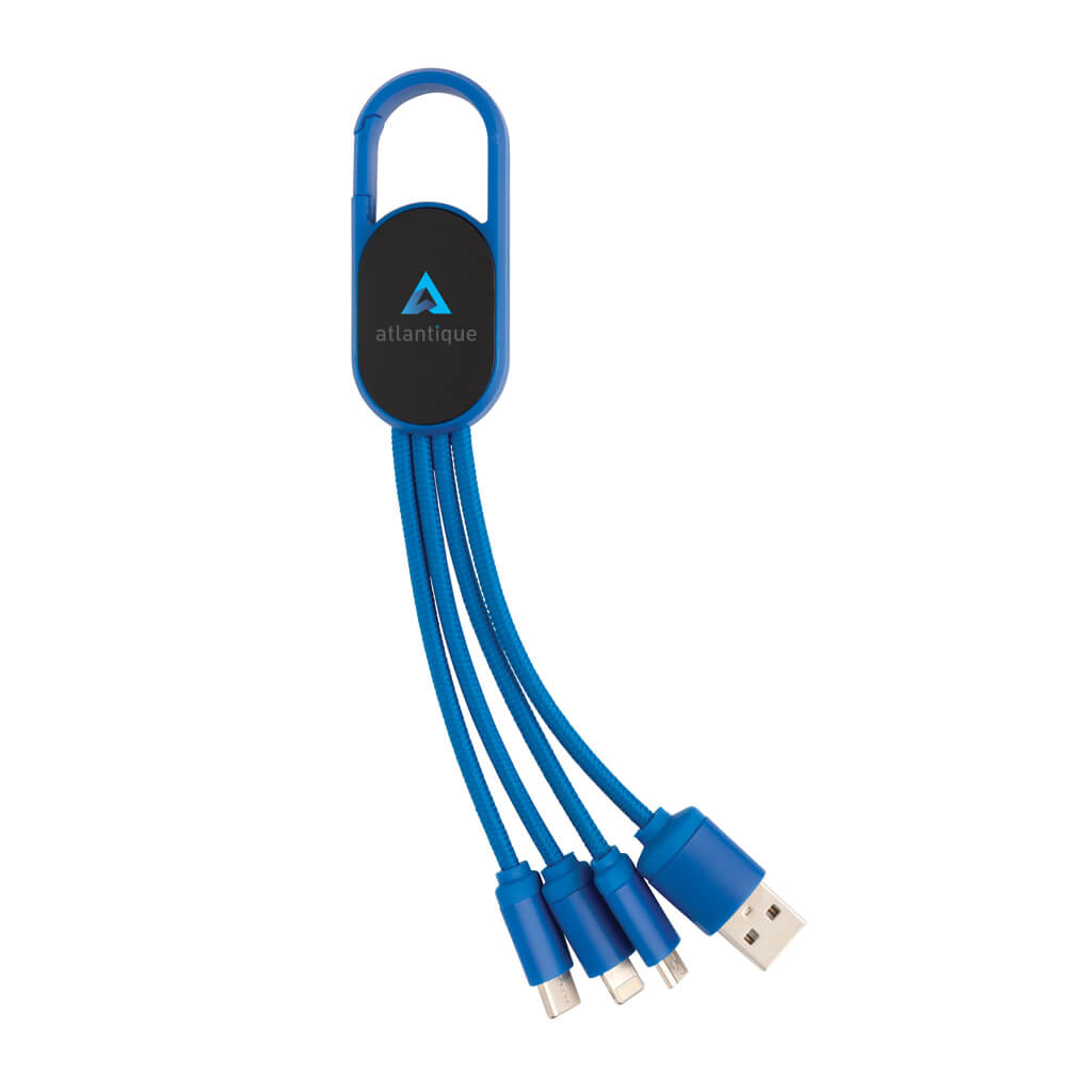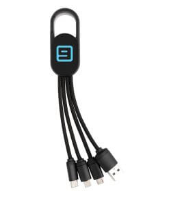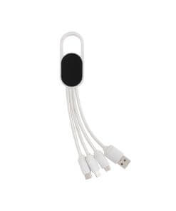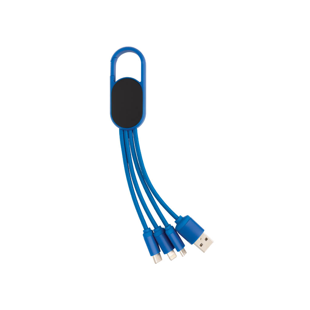 4 in 1 charging cable with carabiner. USB input plug and for output: double-sided connector for IOS devices, micro USB and type C output. Suitable for charging all common mobile devices. ABS material casing with 10 cm long nylon braided cables. Supports up to 2.1A charging.