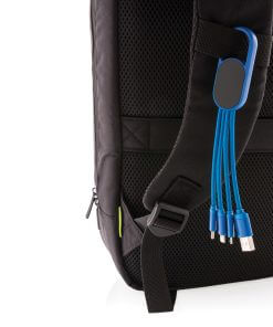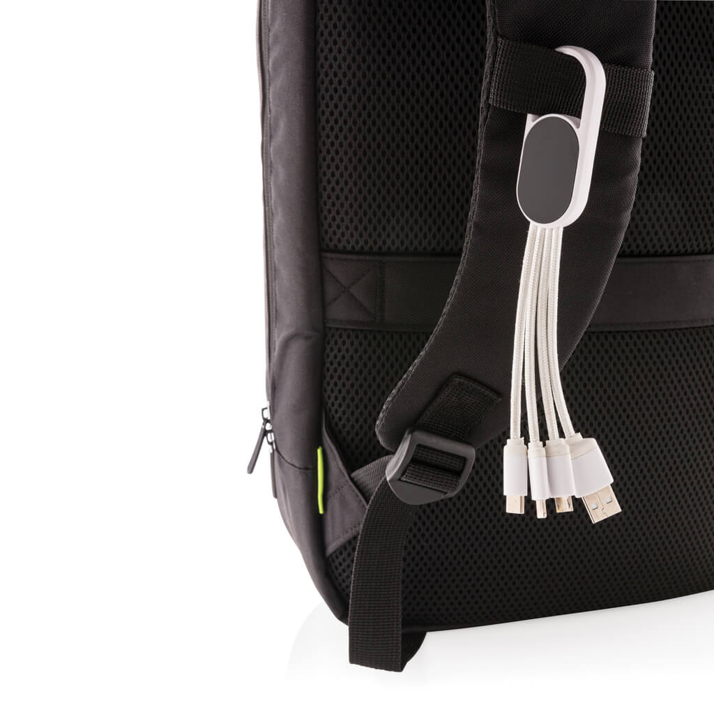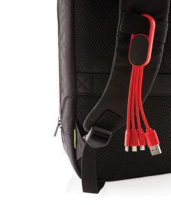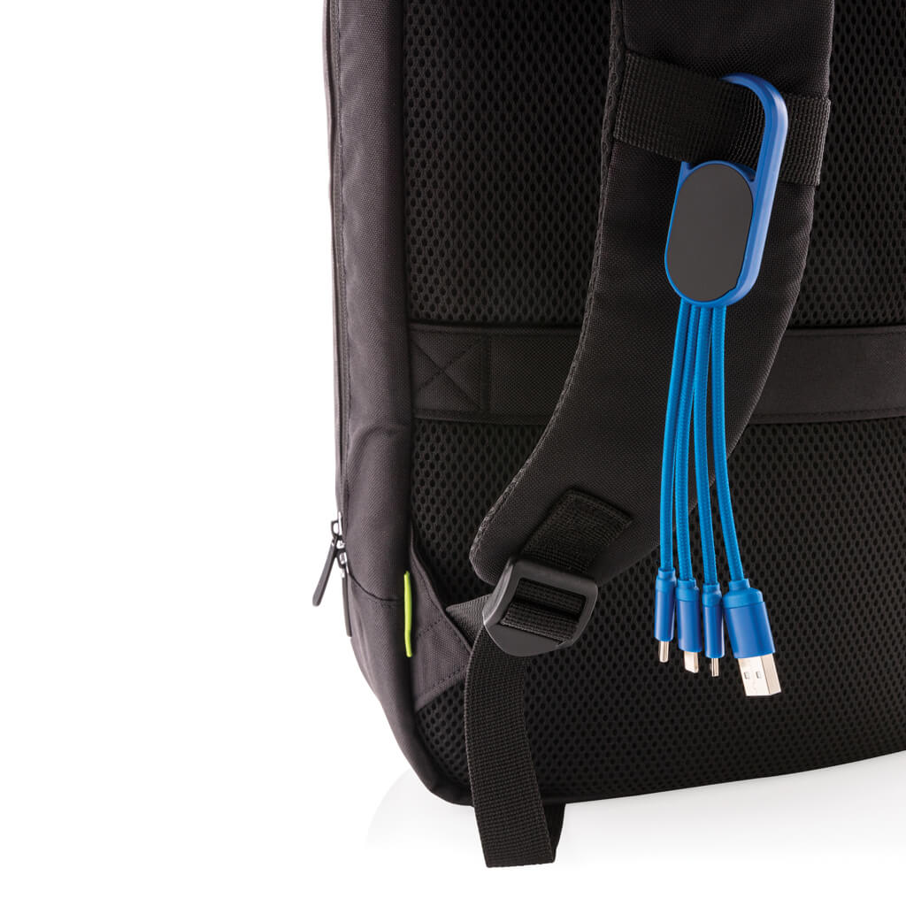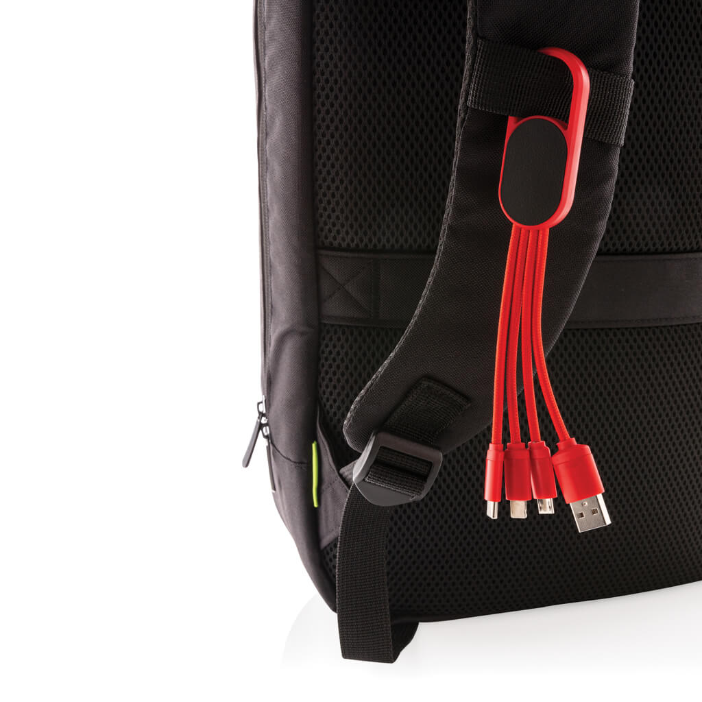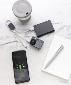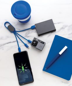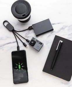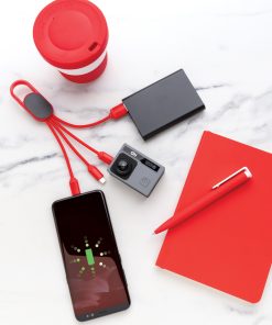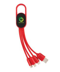 4 in 1 charging cable with carabiner. USB input plug and for output: double-sided connector for IOS devices, micro USB and type C output. Suitable for charging all common mobile devices. ABS material casing with 10 cm long nylon braided cables. Supports up to 2.1A charging.