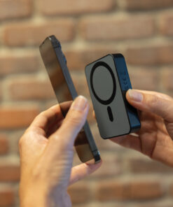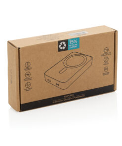 10.000 mAh pocket-size powerbank with 5W magnetic wireless charger with a case made out of RCS certified recycled ABS plastic. RCS (Recycled Claim Standard) is a standard to verify the recycled content of a product throughout the whole supply chain. Total recycled content: 15% based on total item weight. The powerbank, Amporia, contains a long-lasting grade A 10.000 mAh lithium polymer battery and extra strong magnets. The power indicators will indicate the remaining energy level, so you always know when to re-charge. USB-C Input: 5V/2.4A; USB-C Output: 5V/2.4A. Item and accessories are PVC-free. Including RCS certified recycled TPE charging cable. Packed in FSC® mix packaging.
