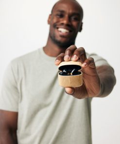 Bamboo true wireless earbuds and case. The earbuds and charging case are made with RCS (Recycled Claim Standard) certified recycled ABS and FSC® 100% bamboo. Total recycled content: 28% based on total item weight. RCS certification ensures a completely certified supply chain of the recycled materials. The perfectly fitting earbuds have a 40 mAh battery and can be re-charged in the 400 mAh charging case within 1 hour. With auto pairing function so easy to pair to your mobile device. Playing time on medium volume about 14 hours. With BT 5.3 for optimal connection. Operating distance up to 10 metres. With pick up and mic. Including 3 size silicone ear tips. Including RCS certified recycled TPE charging cable. Packed in FSC® mix kraft packaging. Item and accessories 100% PVC free.