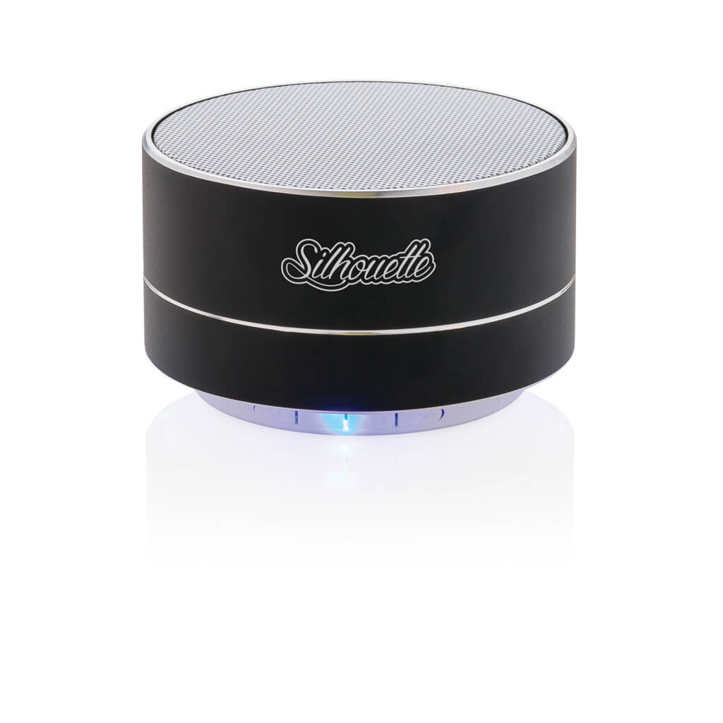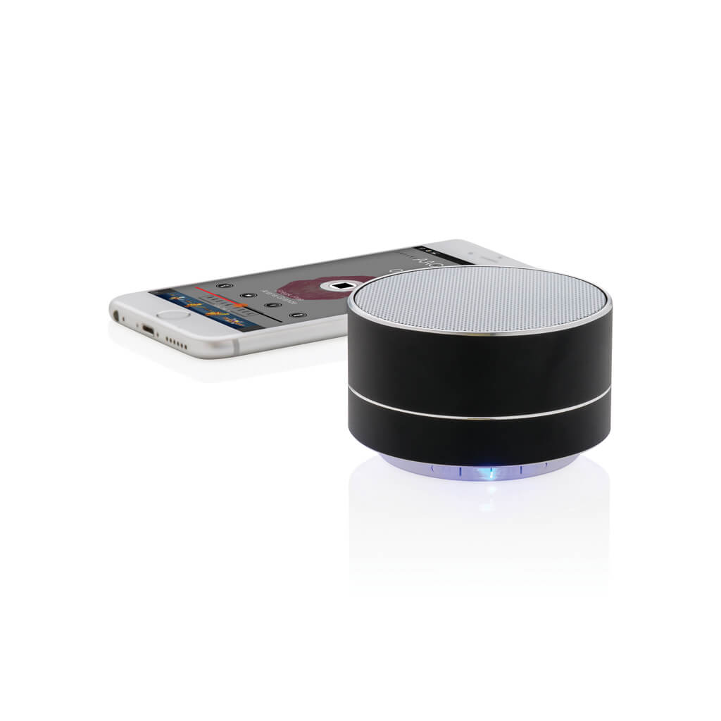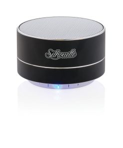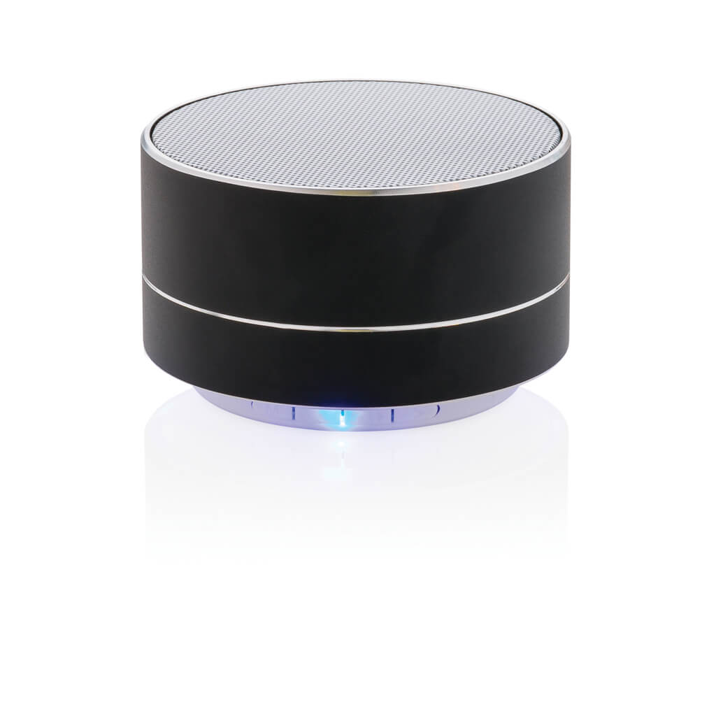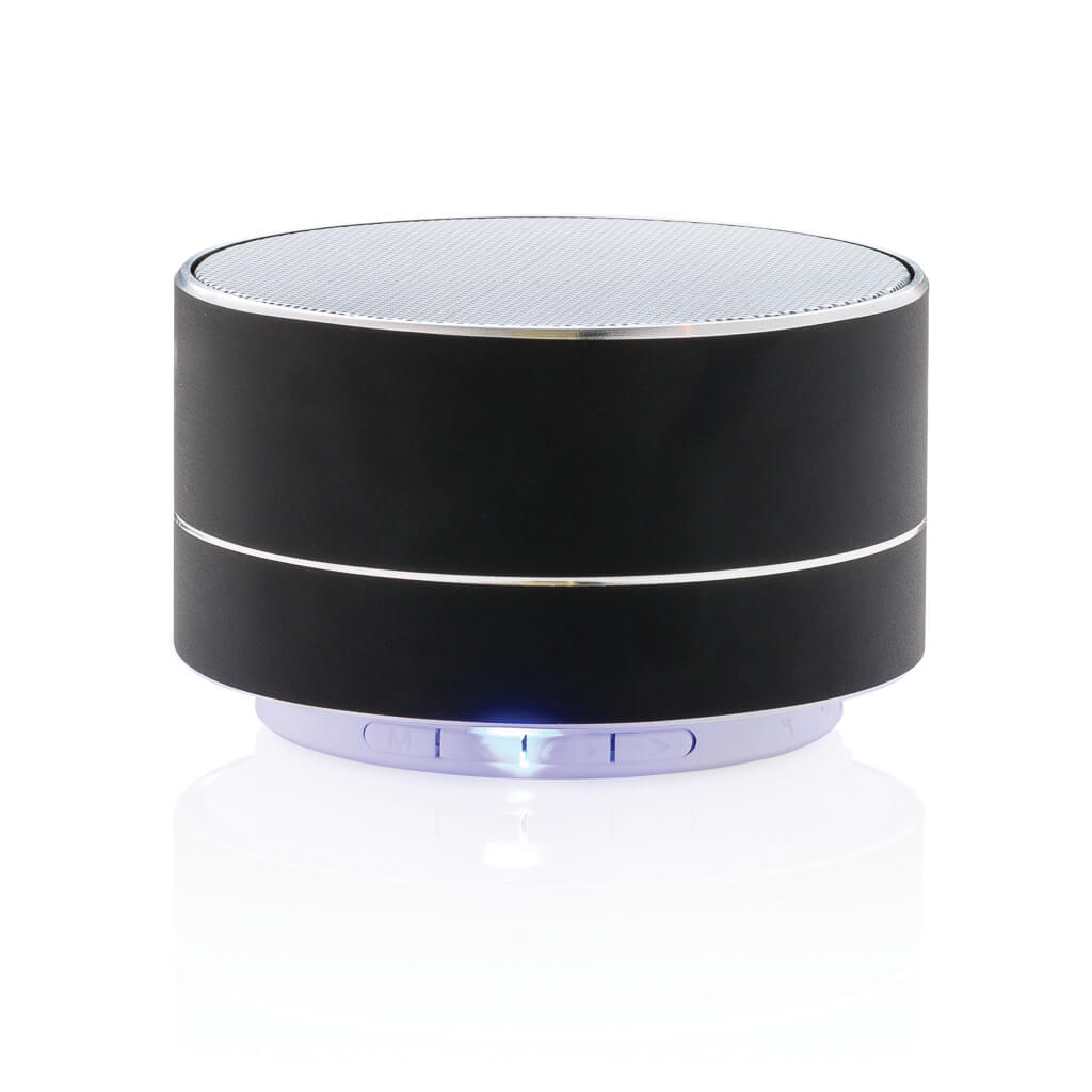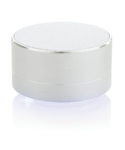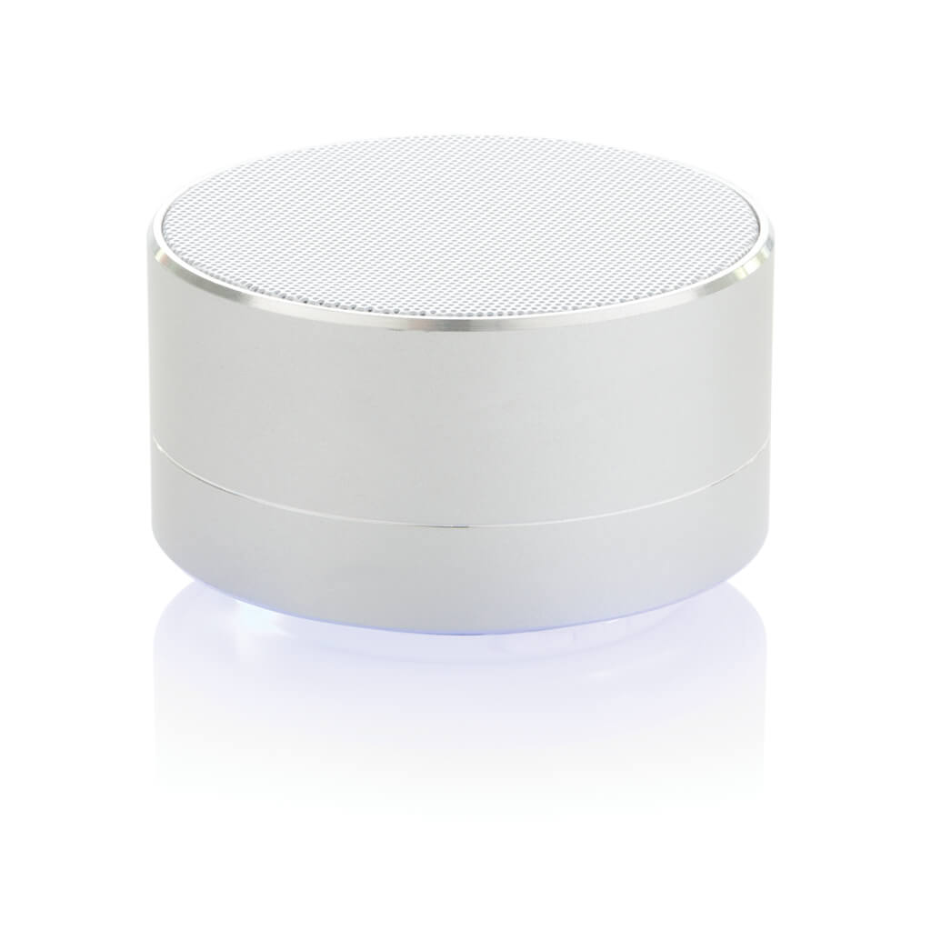 Aluminium 3W speaker with built-in 300 mAh lithium battery. With playing time up to 4 hours on one single charge and operating distance of 10m. Including ambient blue light on the bottom. With pick up function to answer incoming calls.