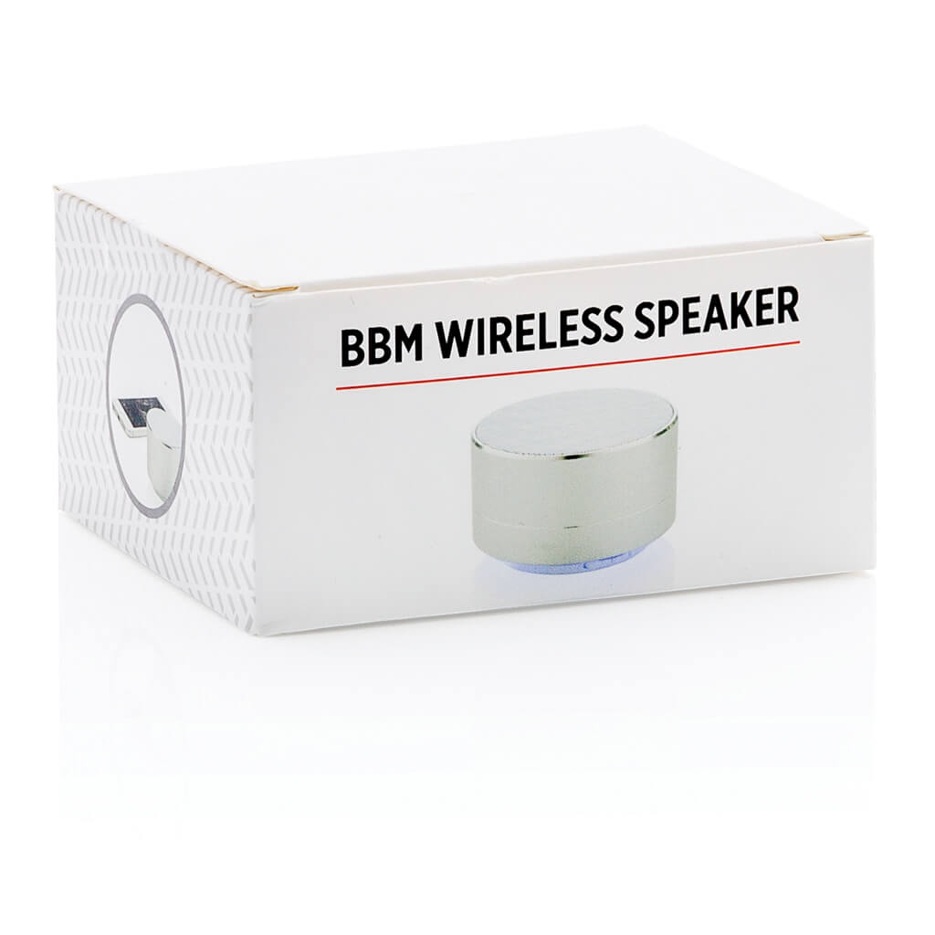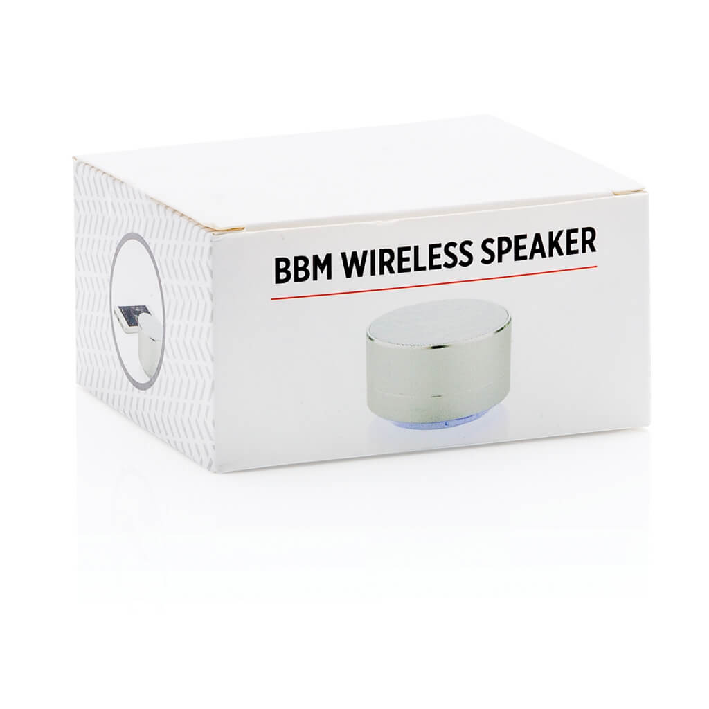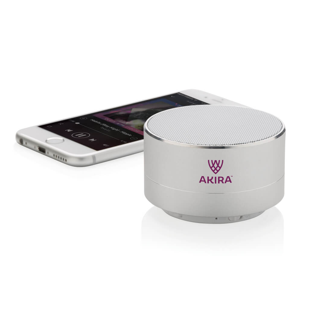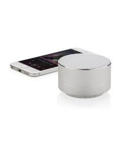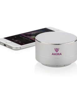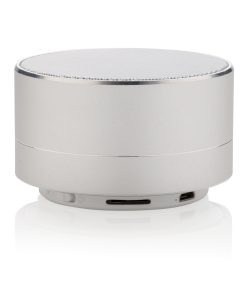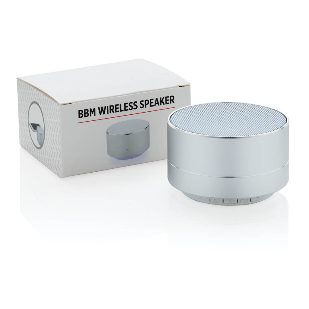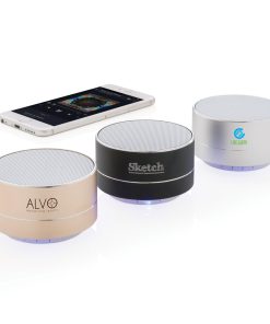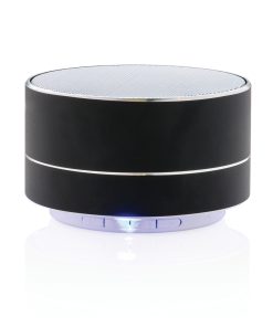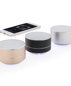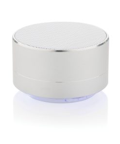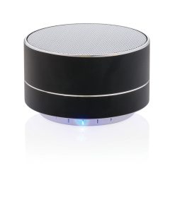 Aluminium 3W speaker with built-in 300 mAh lithium battery. With playing time up to 4 hours on one single charge and operating distance of 10m. Including ambient blue light on the bottom. With pick up function to answer incoming calls.