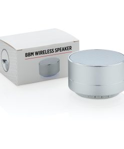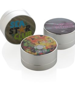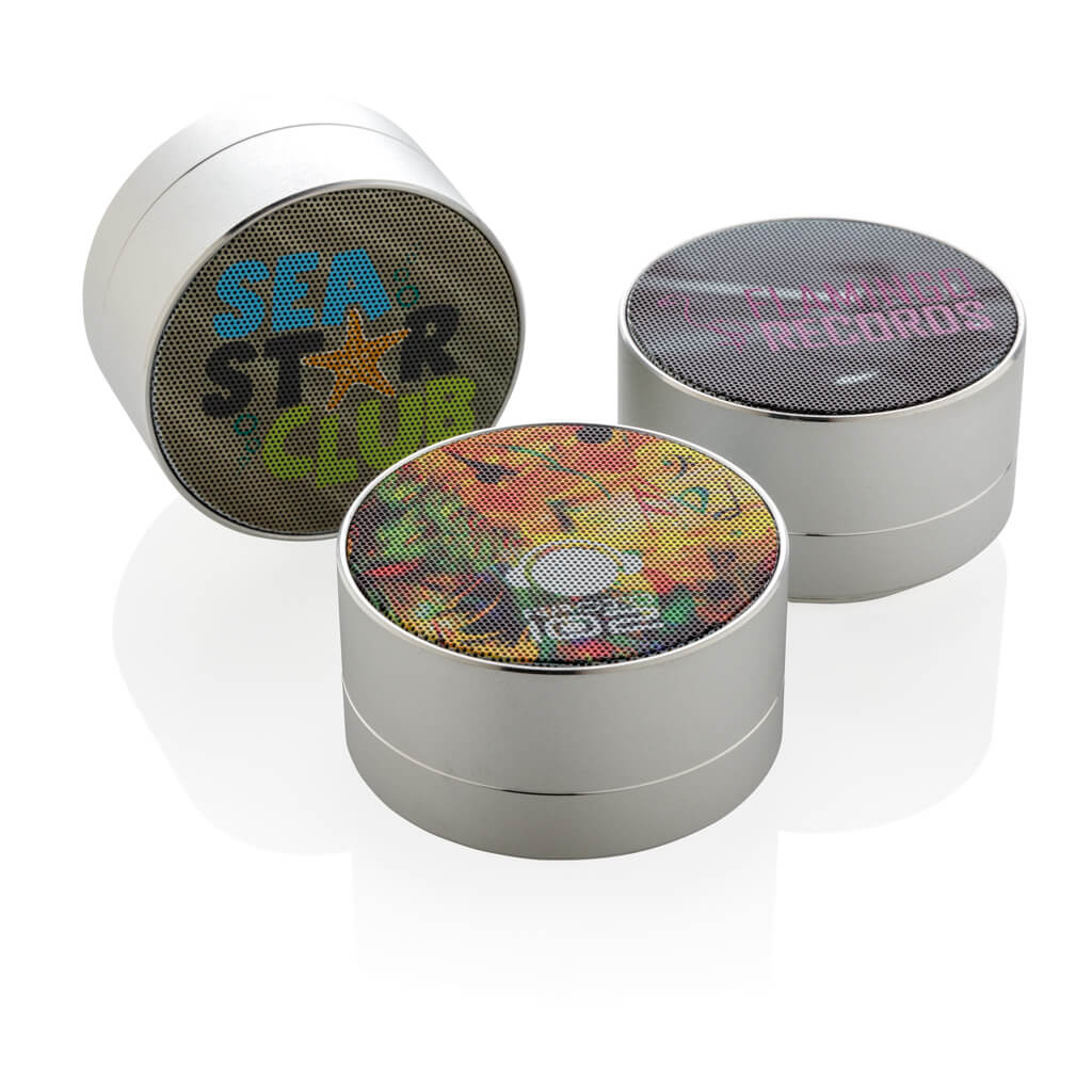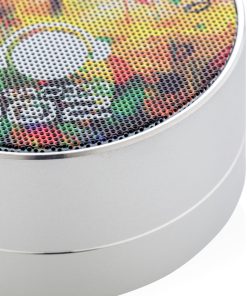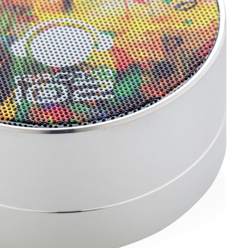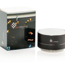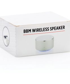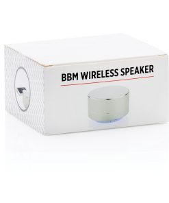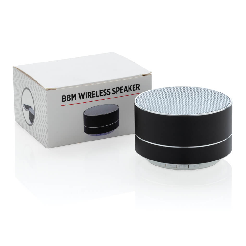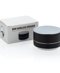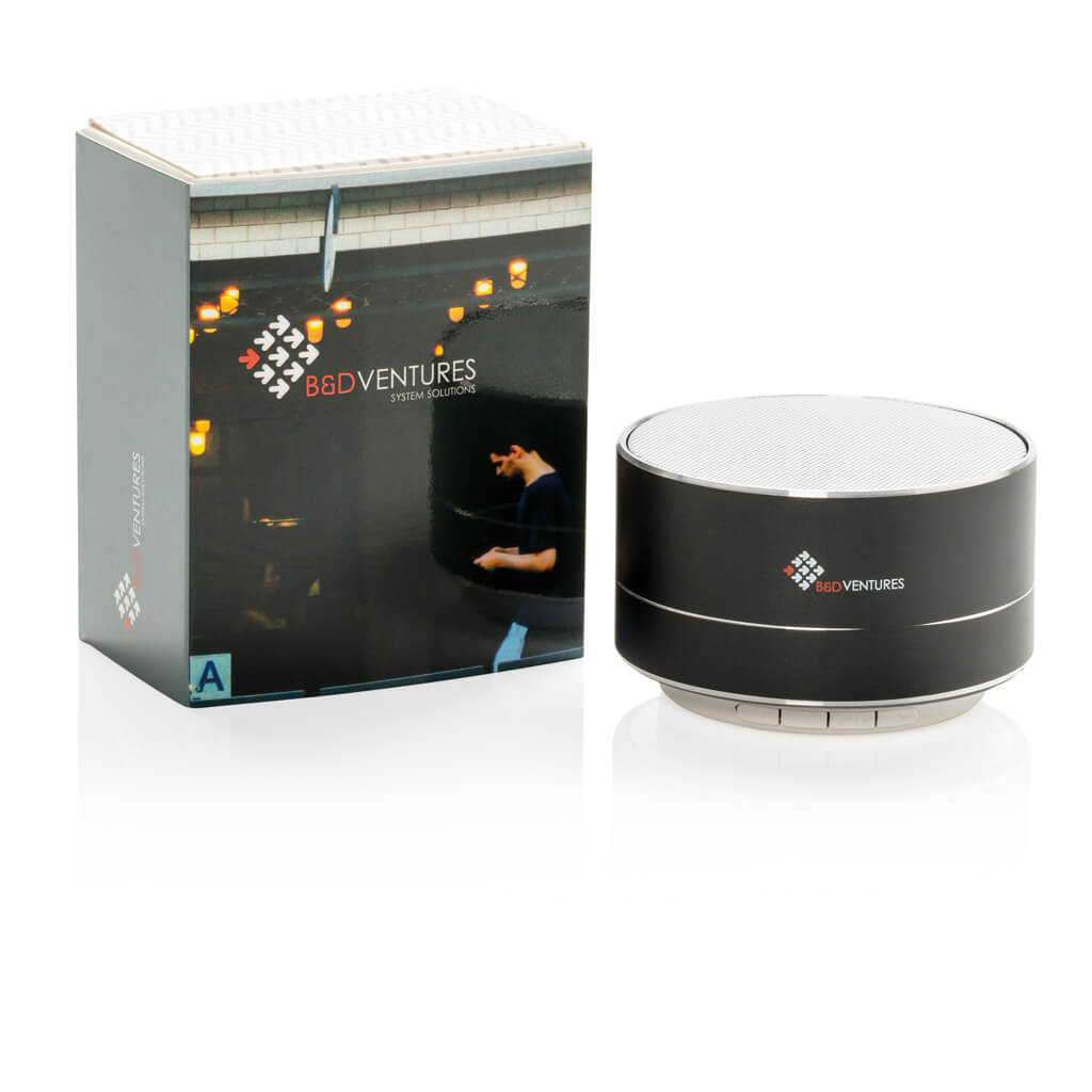 Aluminium 3W speaker with built-in 300 mAh lithium battery. With playing time up to 4 hours on one single charge and operating distance of 10m. Including ambient blue light on the bottom. With pick up function to answer incoming calls.