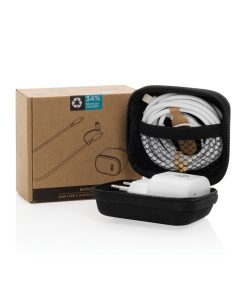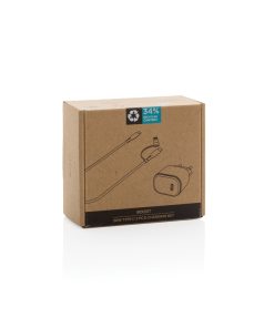 2 pcs 20W fast charging set for mobile devices and other small devices. With EU adapter with 20W USB C port and 120 cm recycled TPE 60W fast charging cable (USB C to USB /Lightning). The cable supports data transfer and also charging of larger devices like laptops. Adapter and cable made from RCS certified recycled PC, ABS and recycled TPE. Packed in pouch made from RCS certified recycled PET. Total recycled content of whole set: 59% based on total item weight. RCS certification ensures a completely certified supply chain of the recycled materials. Packed in FSC® packaging. PVC Free. Input wall charger AC 100-240V 50/60Hz 0.6A; Output wall charger USB-C :5.0V⎓3.0A,9.0V⎓2.22,12.0V⎓1.67A (20W Max);