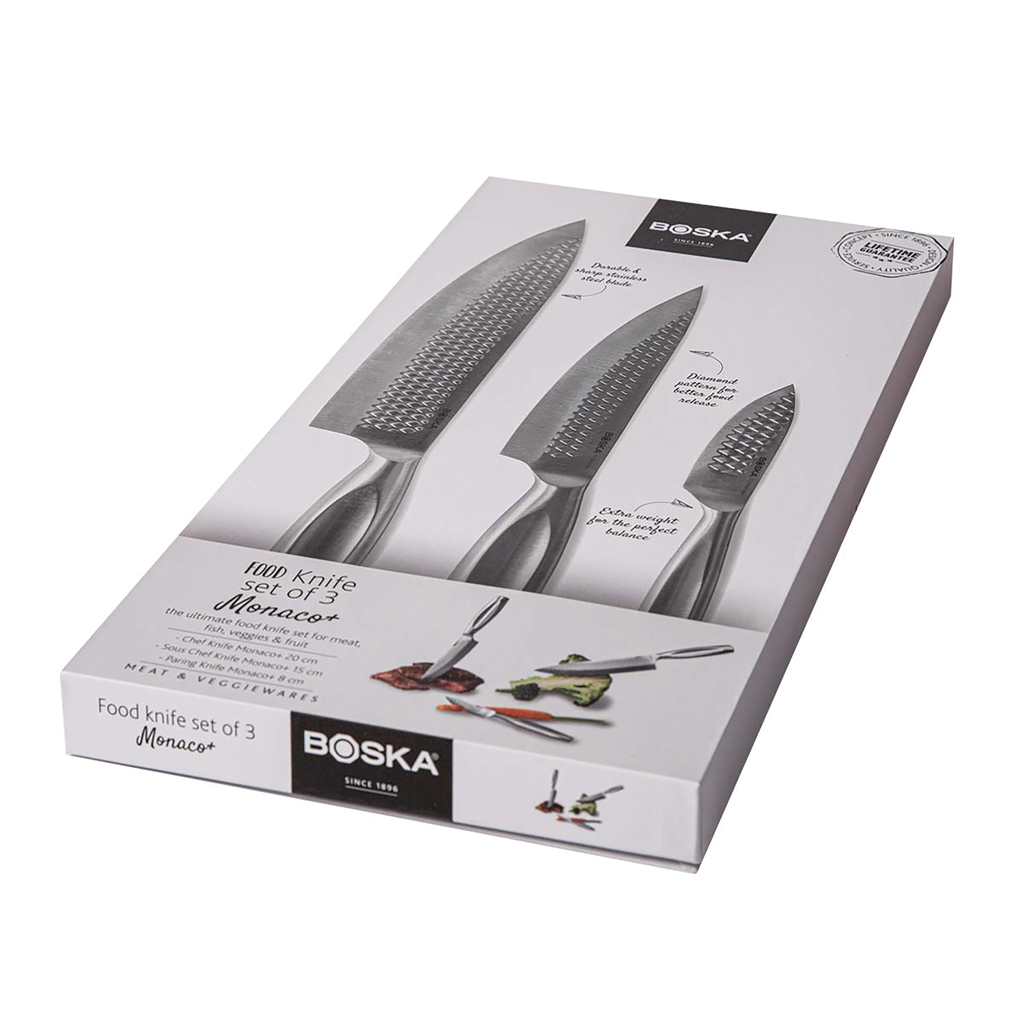 The Monaco+ kitchen knives set, from the brand BOSKA – a B Corporation certified company – is the ultimate set for every food lover. With the same features as the knives for professionals; high-quality stainless steel, extra sharp, and the slender handle for full control of the knife. Cooking Knife – for cutting everything! Sous Chef Knife – because what is a Chef without a Sous Chef. Paring Knife – for cutting vegetables and fruit. This set is handwash only, and backed by a lifetime guarantee.