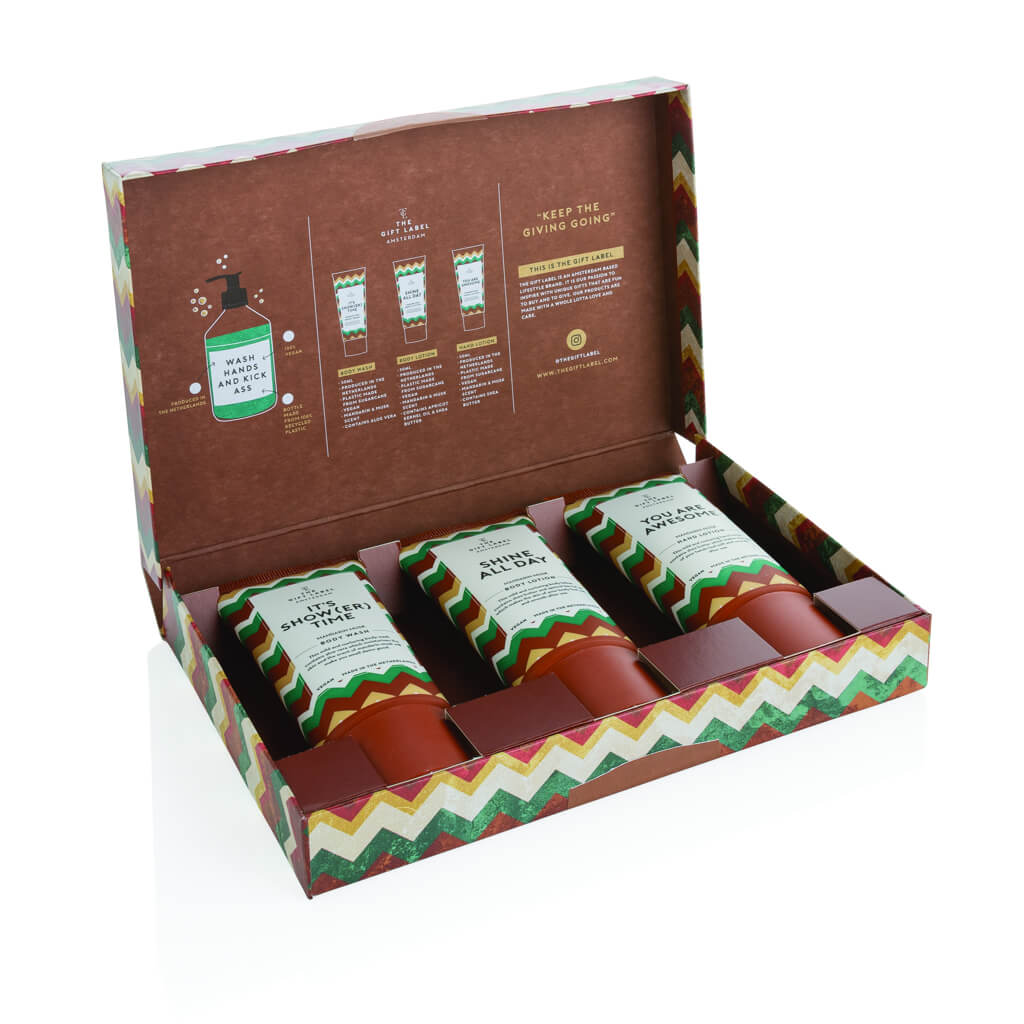 Surprise someone special with this luxurious gift set that fits through the letterbox. It is filled with delicious vegan hand cream (50ml), shower gel (50ml) and body lotion (50ml) in a mandarin musk fragrance. The tubes are made with sugarcane and are produced in the Netherlands. The beautifully designed tubes match the box perfectly. The Gift Label is a lifestyle brand based in Amsterdam. It is their passion to create products that are loved and spread happiness. Unique gifts that are fun to buy and even more fun to give!