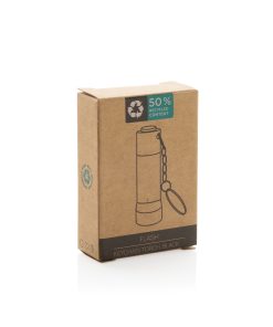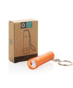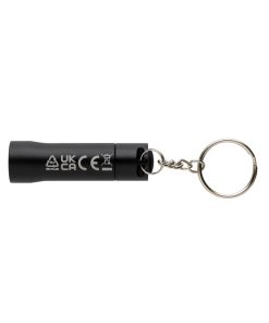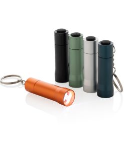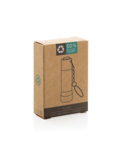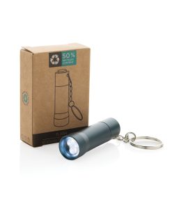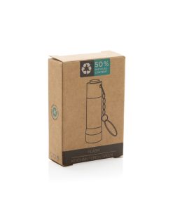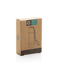 3 LED pocket size torch made with RCS recycled aluminum Total recycled content: 50% based on total item weight. RCS certification ensures a completely certified supply chain of the recycled materials. With 15 lumen that allow an operating time up to 6 hours on one set of batteries (included) With keychain. Beam distance: 3 metre. Packed in FSC® mix kraft packaging.