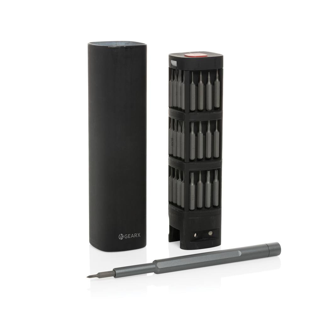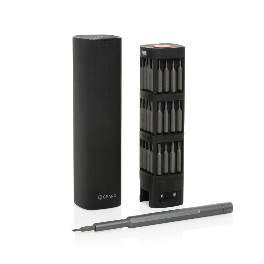 The ultimate high-performance precision bit kit includes essential parts for repairing mobile phones, tablets, PCs and other items. Most electronics life can be extended easily with a simple repair that often can be found online in „how to“ guides. 56 pcs packed in case made with RCS certified recycled aluminum. Total recycled content: 22% based on total item weight. RCS certification ensures a completely certified supply chain of the recycled materials. Set includes screwdriver handle and tweezers. The bits are magnetic and are easy to place and take out from the case.