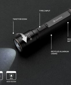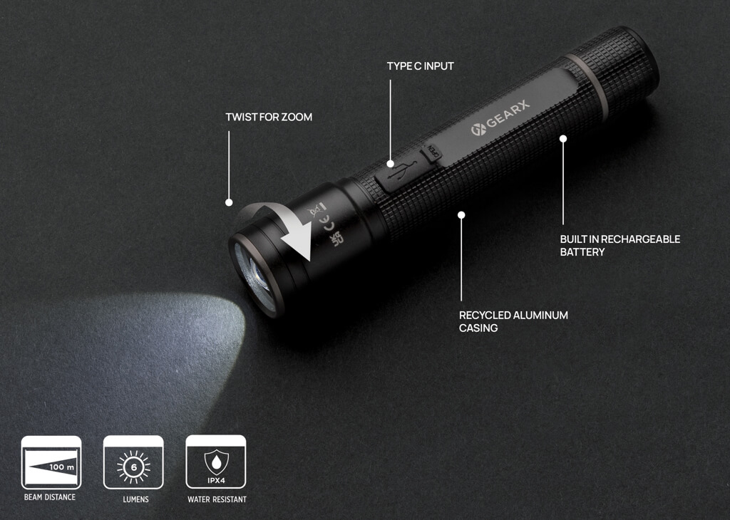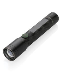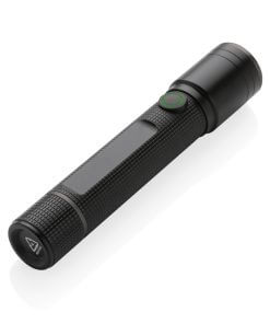 Functionality, performance and design all come together in this re-chargeable 3W torch made with RCS certified recycled aluminum. Total recycled content: 20% based on total item weight. RCS certification ensures a completely certified supply chain of the recycled materials. Because of its IP4 rating, it is weatherproof so can easily be taken outside. The powerful bulb creates up to 100 lumen and a beam that reaches up to 100 metres. The torch uses a re-chargable A-grade battery so no need to replace the batteries. Simply re-charge via your USB socket and the included RCS certified recycled type C cable. The high quality bulb comes with 5 modes including SOS function. The 500 mah battery allows a usage up to 4 hours on a single charge. Aluminum does not lose its characteristics in the recycling process and can be recycled endlessly. Item and accessories 100% PVC free. Packed in FSC mix packaging.