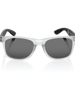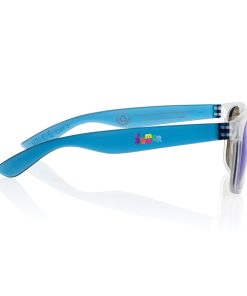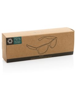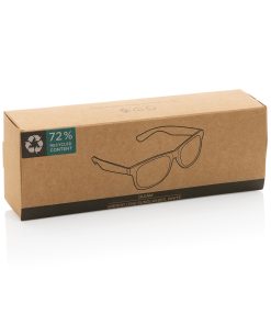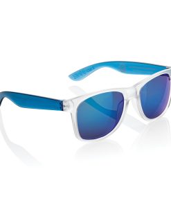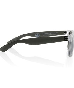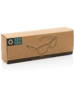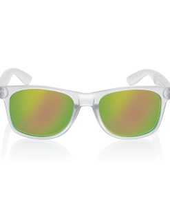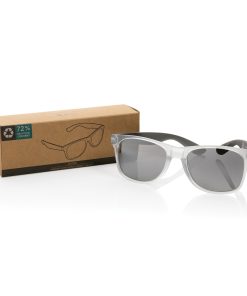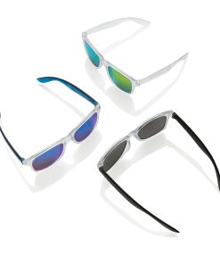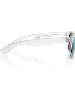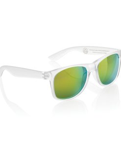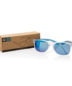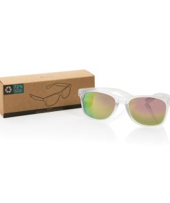 Sunglasses made with RCS certified recycled transparent PC frame. With colored mirrored lenses. Total recycled content: 72% based on total item weight. RCS certification ensures a completely certified supply chain of the recycled materials. The lenses are conform EN ISO 12312-1,UV 400 and CAT 3. Packed in a FSC® kraft box.