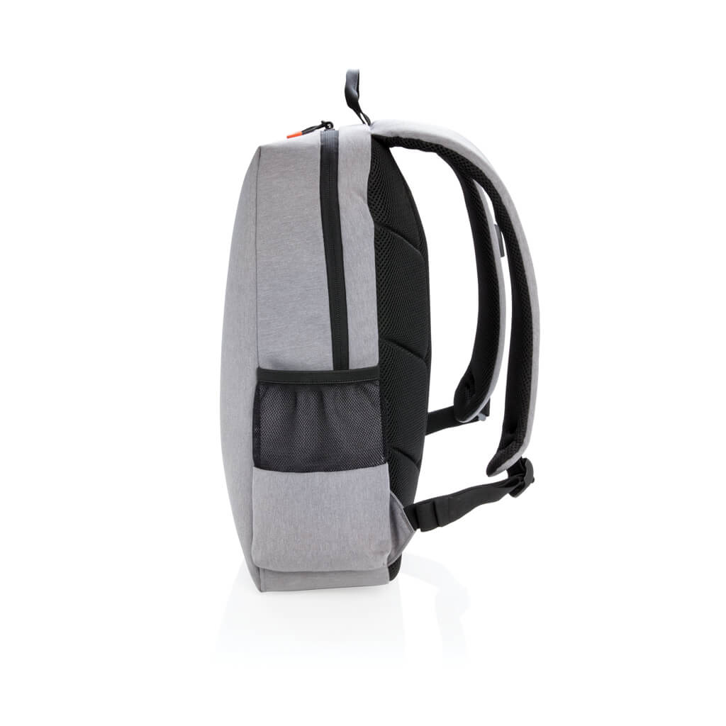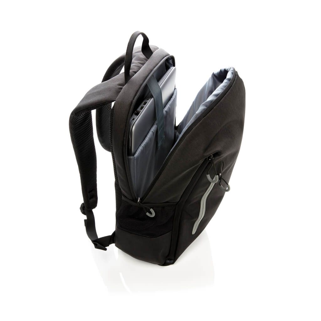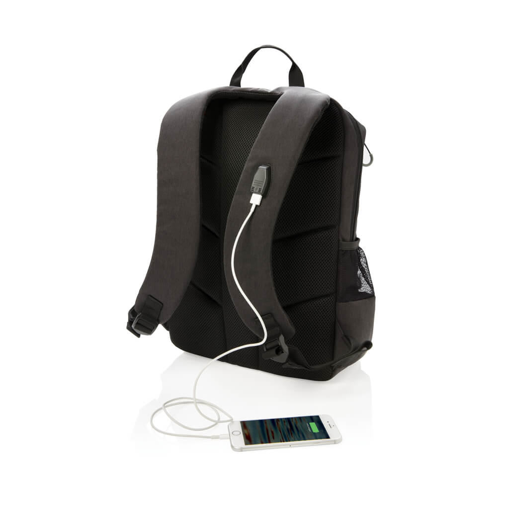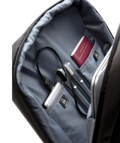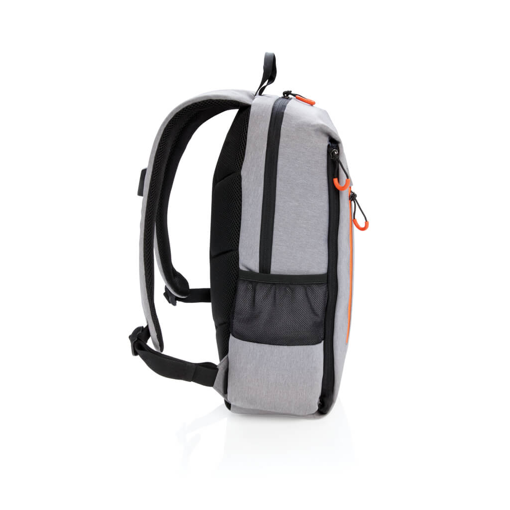 Simple, practical and durable everyday backpack with 2 side pockets for water bottles or your umbrella. Convenient USB output on the strap. Padded 15.6″ compartment for laptop computer as well as several spacious compartments and RFID protected sleeve pockets. Registered design®