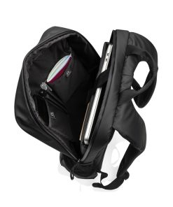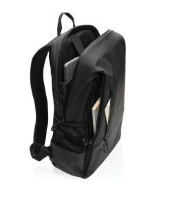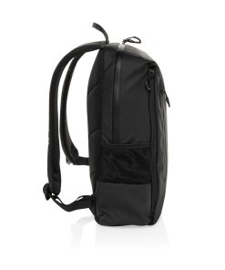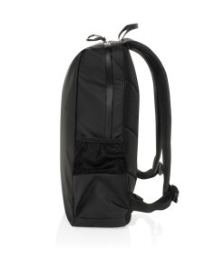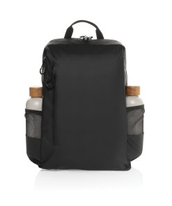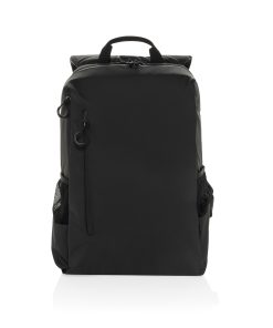 The Lima Aware™ RPET Water-Resistant 15.6 Inch Laptop Backpack offers the perfect blend of style and protection for your tech. Made from 100% rPET with a PU backing, this backpack is designed to safeguard your essentials. The main compartment features a dedicated laptop section for 15.6-inch laptops, with an exclusive logo in the top left corner and a Velcro strap for extra security. Inside, you’ll find two RFID-protected pockets and two pen loops for organization. The bag also boasts two front zipper pockets, four zipper pullers with black accents, and two side pockets made from half mesh, half polyester. Adjustable shoulder straps ensure comfort, while the front and back waterproof zippers protect your belongings from the elements.Made with recycled polyester embedded with the AWARE™ tracer. 2% of proceeds of each product sold with AWARE™ will be donated to Water.org. PVC free.