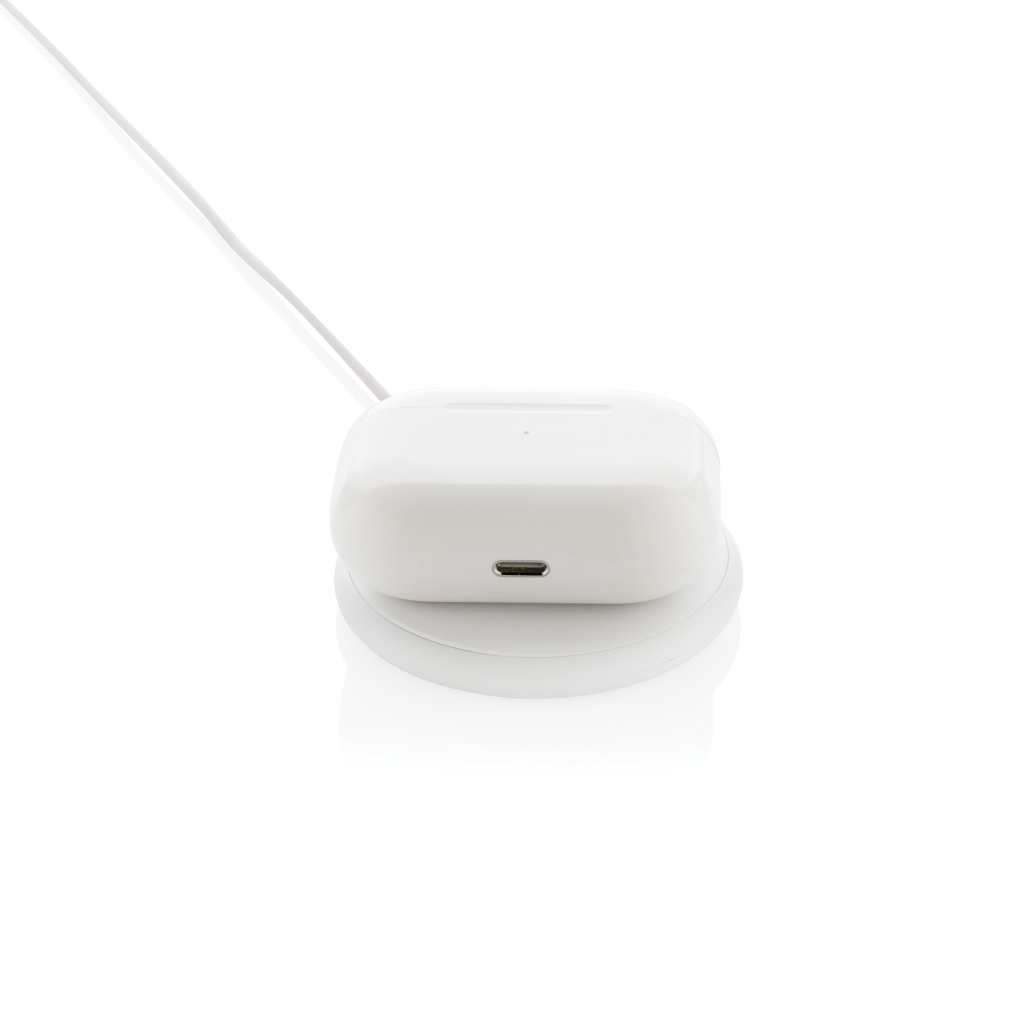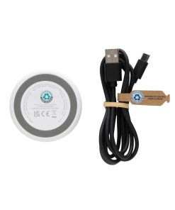 Unique design 15W magnetic wireless charger that gives you the option to charge either your mobile device, earbuds or iWatch. Simply click them on and start charging. Made with recycled ABS and recycled TPE. Total recycled content: 35% based on total item weight. RCS certification ensures a completely certified supply chain of the recycled materials. Including 120 cm USB A to USB C charging cable made from RCS certified recycled TPE. Packed in FSC® packaging. PVC Free. Output 9V.2.2A Output watch: 9V/0.4A, Output earbuds: 9V/0.5A. Input 9V/3A.