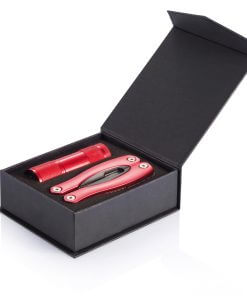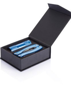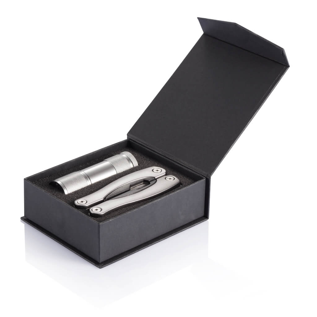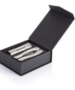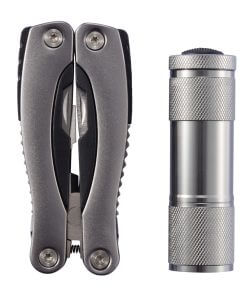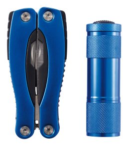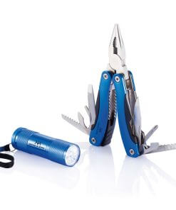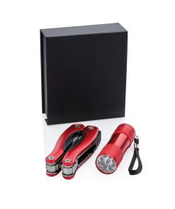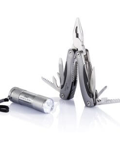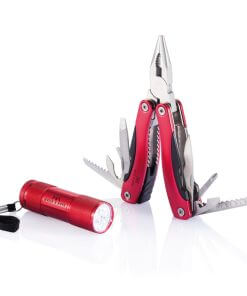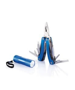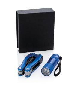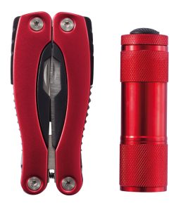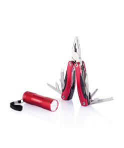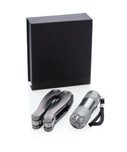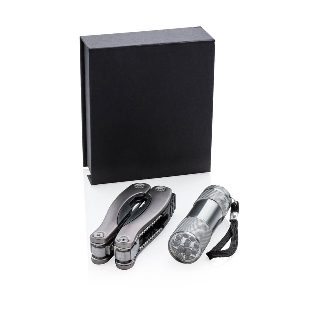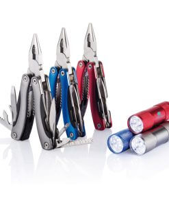 Set with 14 functions, stainless steel multitool with aluminium anodised handle and aluminium torch with 9 white LED’s.