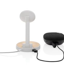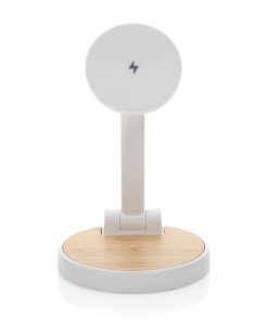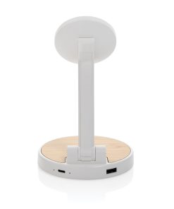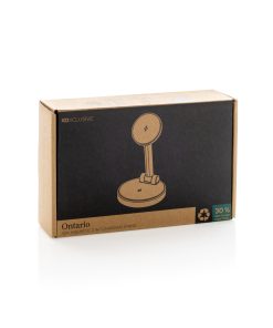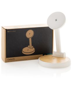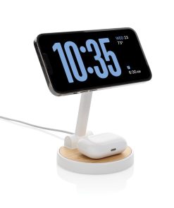 15W 2-in-1 fast wireless charger with magnetic charging made with with RCS (Recycled Claim Standard) certified recycled ABS. Total recycled content: 30% based on total item weight. RCS certification ensures a completely certified supply chain of the recycled materials. Bamboo wireless charging area made from FSC 100% bamboo. With magnetic 15W charger and one 5W charger for other wireless chargeable items like earbuds. With one USB A port to charge items via cable. Item and accessories PVC free. Including 120cm type C charging cable made from RCS certified recycled TPE. Packed in FSC mix kraft box. 9V/3A; W: 9V/1.1A; 9V/1.67 A/(15W), Earbuds: 5V/1A (5W), USB output 5V / 2.1A. PVC free.