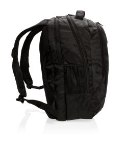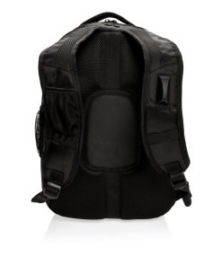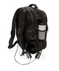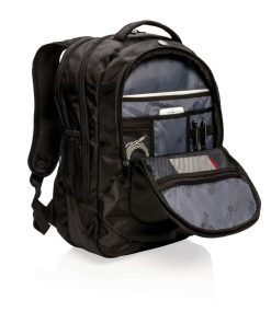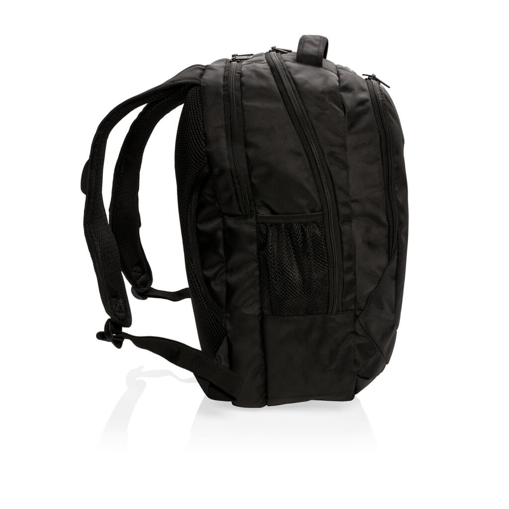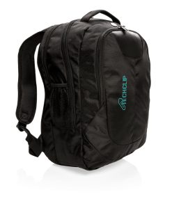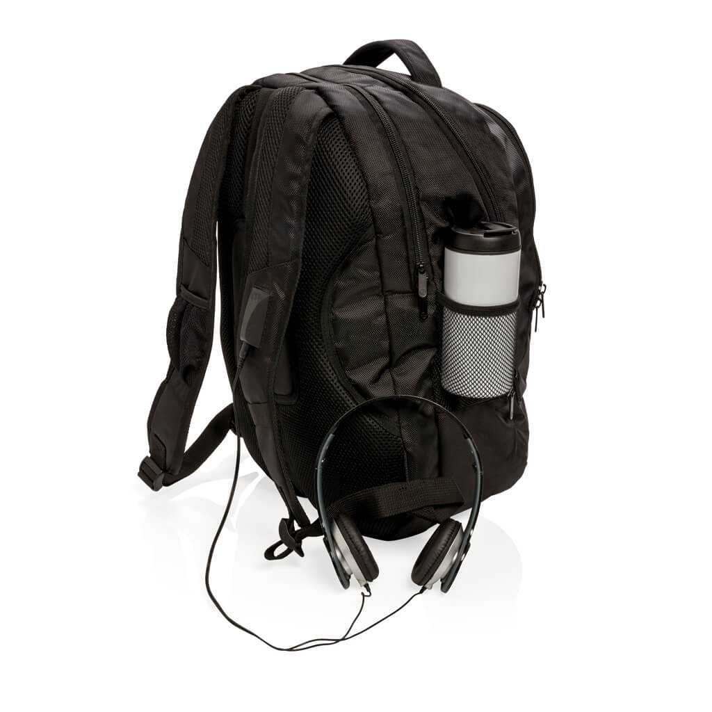 1680D polyester laptop backpack with unique balance between comfort and outdoor protection. The backpack has pockets for all your necessities from padded laptop compartment and iPad holder, to pen loops and mesh pockets. On the shoulder strap there is an audio jack to connect your headphone and a sunglasses carrier. It even has a rain cover to protect it all. Registered®