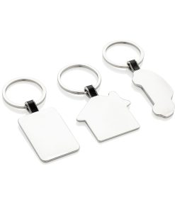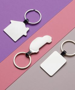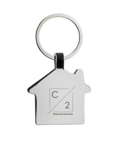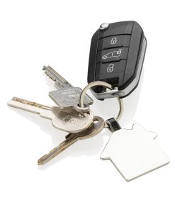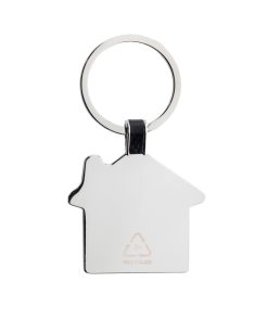 House shaped keychain made from RCS recycled zinc alloy. Total recycled content: 84% based on total item weight. RCS certification ensures a completely certified supply chain of the recycled materials. Packed in paper bag.