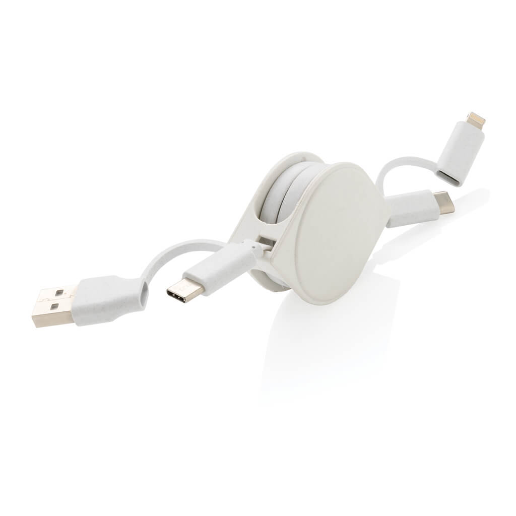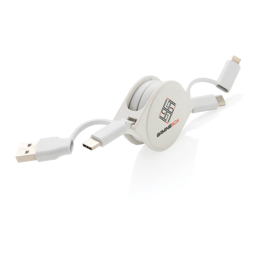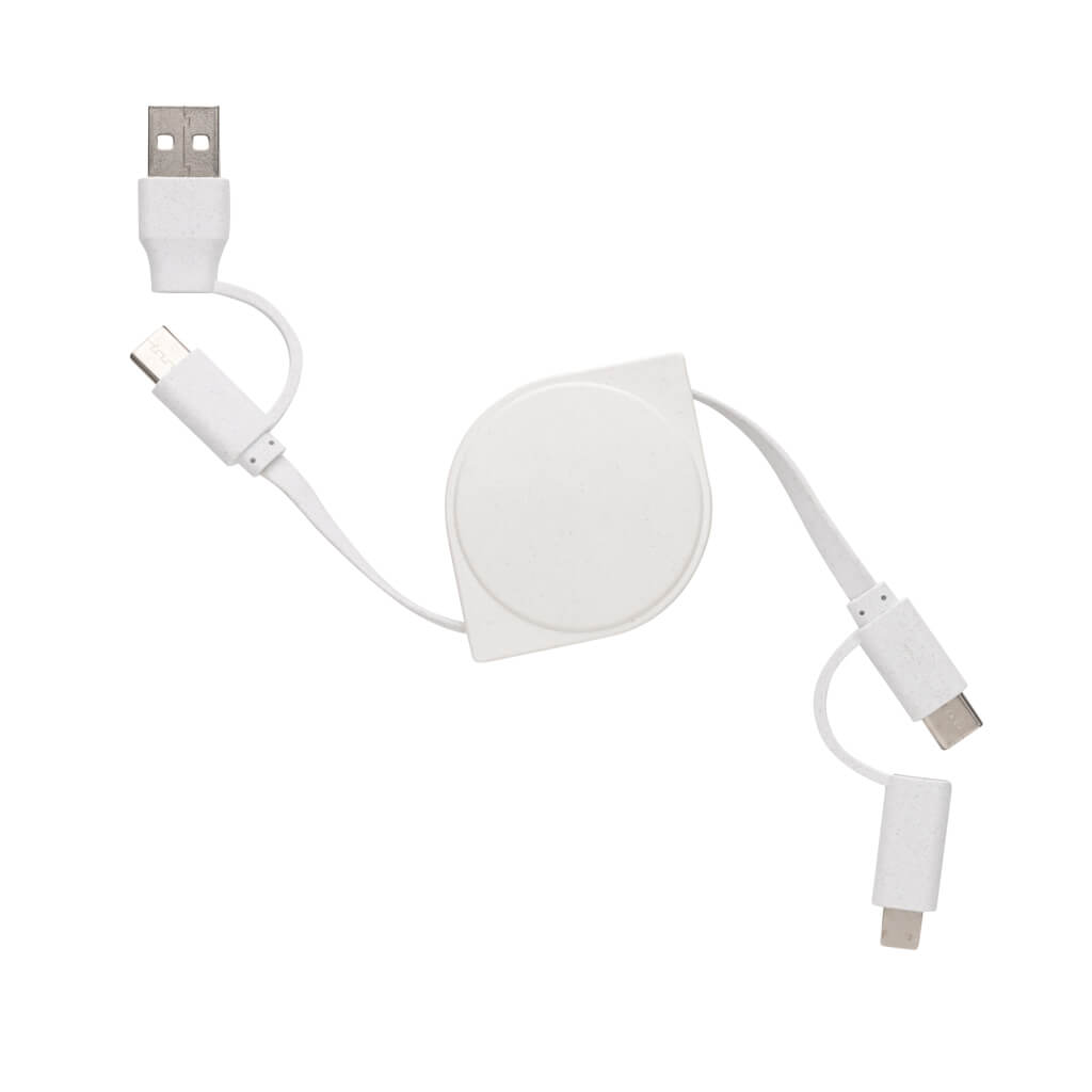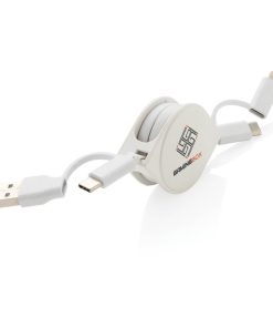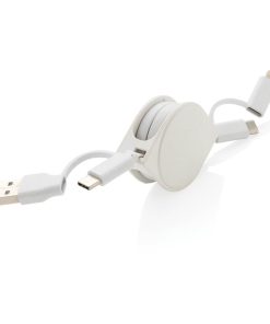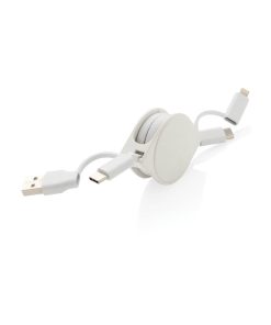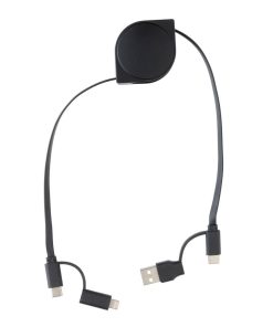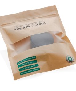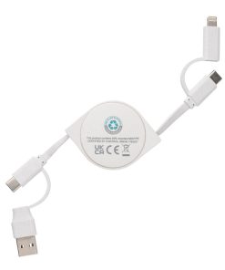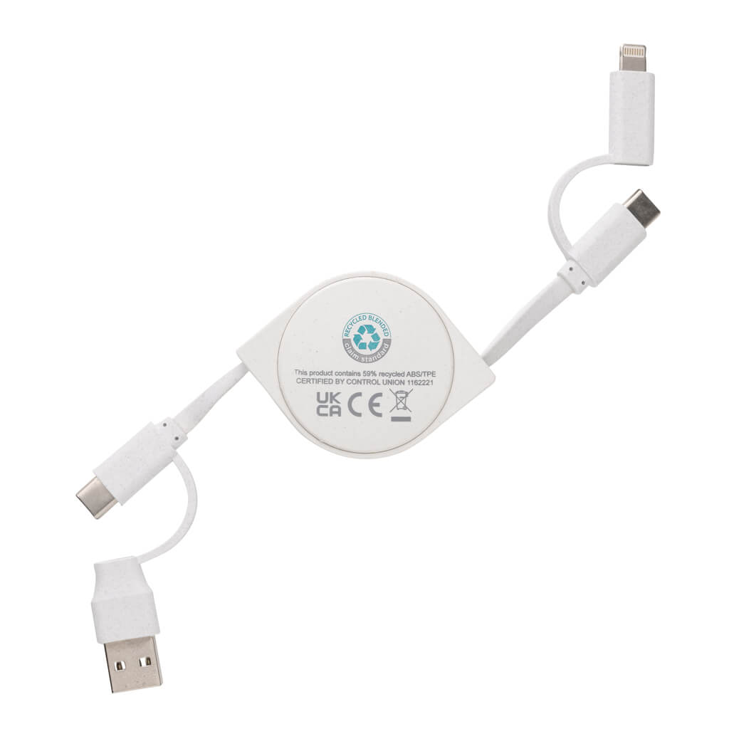 6-in-1 retractable cable where the case is made out of RCS certified recycled ABS plastic and the wire from recycled TPE. Total recycled content: 59% based on total item weight. RCS (Recycled Claim Standard) is a standard to verify the recycled content of a product throughout the whole supply chain. RCS is the standard that is used when a part of the item has been made from recycled materials. The cable has 5 different connectors: USB C in, USB A in, type C out, IOS out and micro USB out. This allows you to use the cable with type C output devices that are included in the newer generation of phones and macbook computers. The cable also has a USB A output input option so it can charge any device from any output source. Item is completely PVC free.