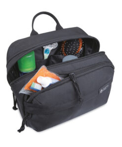 A modern and sustainable update to your go-to toiletry bag using recycled fabric and webbing made from plastic bottles. Front zippered pockets for storing travel essentials. Large zippered main compartment with interior pockets to keep your toiletries organised. Top grab handle. Includes AWARE™ Virtual ID & Product passport, which delivers an indisputable way to track and validate textile composition impact from origin to consumer. To access, scan the QR code located inside the product or visit wearaware.co to learn more. Available across both sides of the Atlantic. This item is also offered by Gemline for customers in the US and Canada.