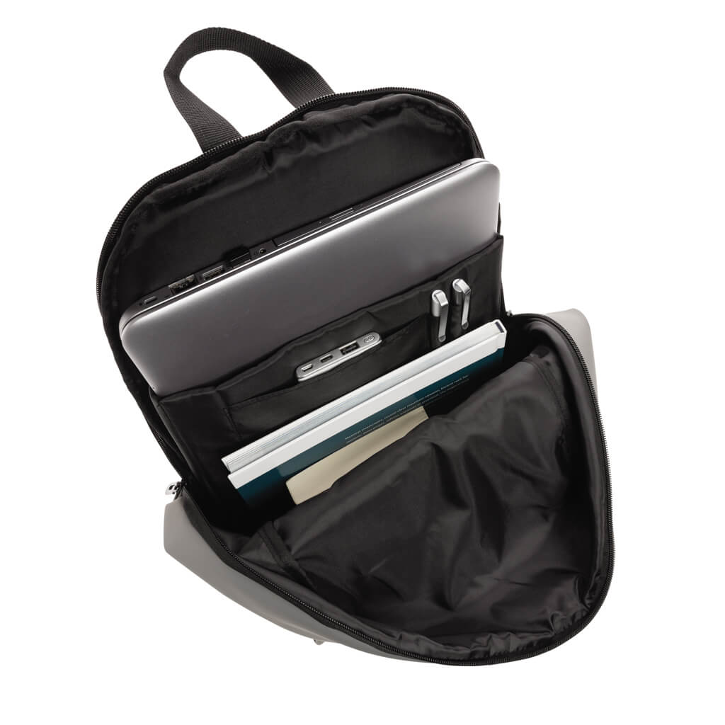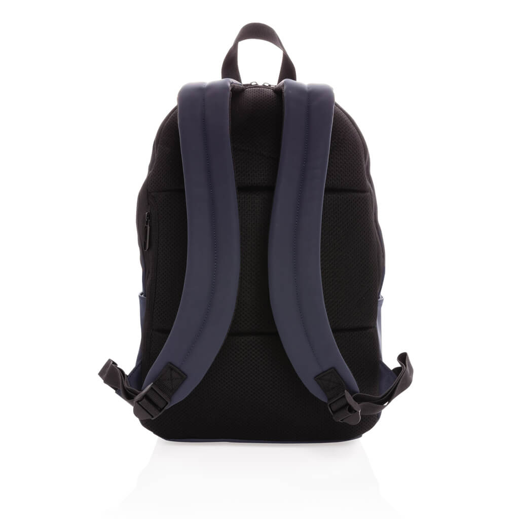 This minimalist, modern backpack made of smooth PU is fully lined and features an inner 15.6 inch laptop compartment, a spacious main compartment and 2 inner pockets and 2 pen loops. Mesh padded back and adjustable straps. Exterior 100% PU. Interior 100% 210D polyester. PVC free.
