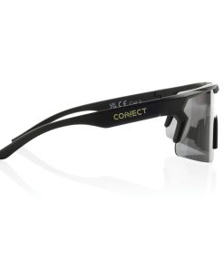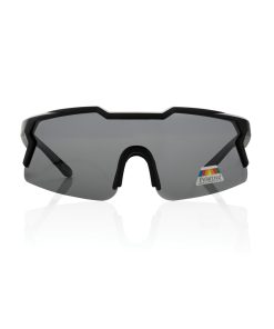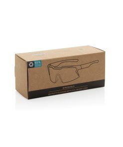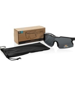 Sport design polarized sunglasses made with RCS certified recycled PC frame. Total recycled content: 65% based on total item weight. RCS certification ensures a completely certified supply chain of the recycled materials. Including recycled RPET sleeve to store the glasses in .The lenses are polarized which eliminates reflecting sunlight, making it ideal for sports and outdoor activities. Conform EN ISO 12312-1, UV 400 and CAT 3. Packed in FSC® gift packaging.