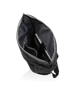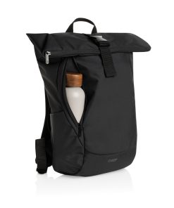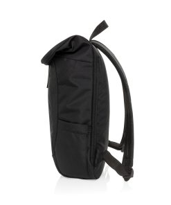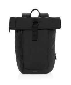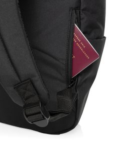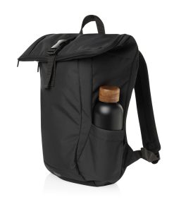 The Swiss Peak Aware™ RPET Leonard 15.6 Inch Laptop Backpack is a perfect blend of style and functionality. Crafted from 100% rPET, this trendy backpack features adjustable shoulder straps and a unique flap design that adds 14cm of extra height when needed. The main compartment opens in an L-shape for easy access, with additional security provided by webbing and buckle closures. Inside, it comfortably fits a 15.6-inch laptop secured by a Velcro closure, along with a convenient internal zipper pocket. The bag also includes a front zipper compartment, a drink holder pocket, and a webbing handle on top, making it ideal for business and daily use. Made with recycled polyester embedded with the AWARE™ tracer. 2% of proceeds of each product sold with AWARE™ will be donated to Water.org. PVC free.