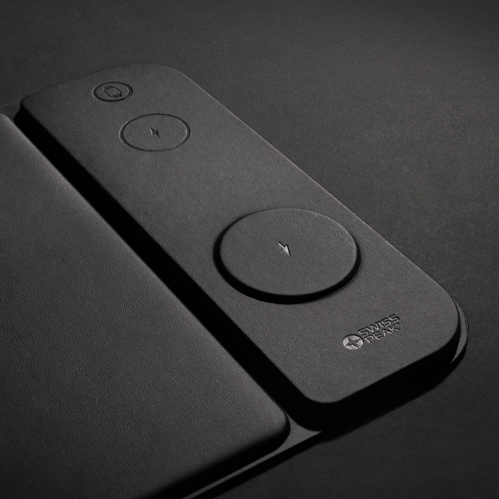 Luxury 3-in-1 wireless charger mousepad made with RCS recycled PU. Total recycled content: 5% based on total item weight. RCS certification ensures a completely certified supply chain of the recycled materials. The wireless charger comes equipped with a magnetic 15W wireless charger and an additional 5W wireless charger suitable for earbuds cases or other small wireless chargeable devices and a 2.5W wireless charger for smartwatches ( Apple watches only). Including RCS certified 120 cm recycled TPE cable. Packed in FSC® mix packaging. Item and accessories 100% PVC free. Input: 9V/3A for optimal use. Output: Phone: 9V/1.1A; 9V/1.67 A/(15W), Earbuds: 5V/1A (5W), Watch: 5V/0.5A.