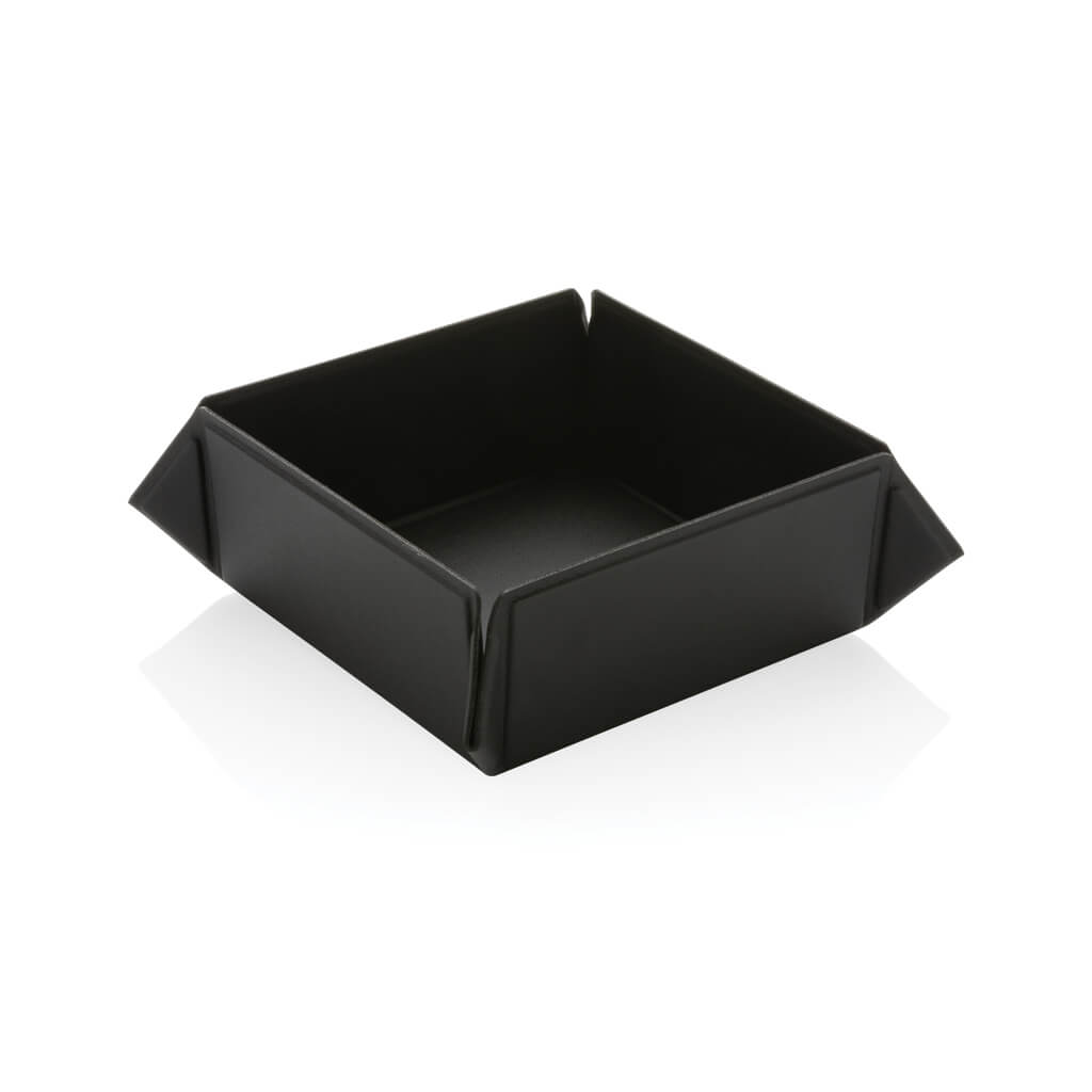 Foldable and magnetic storage box made with RCS certified recycled PU. Total recycled content: 21% based on total item weight. RCS certification ensures a completely certified supply chain of the recycled materials. The storage box comes flat in the packaging and can easily be folded into a storage box with the integrated magnets. Perfect for your desk or your bedside table. Packed in FSC® mix packaging.
