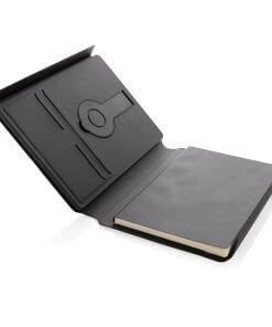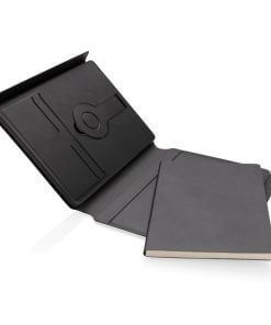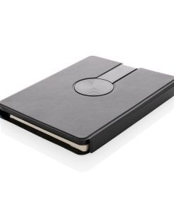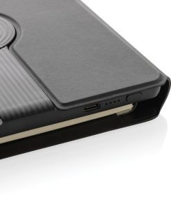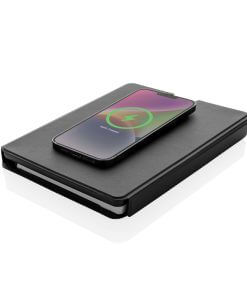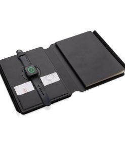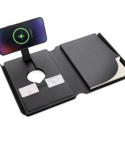 Charge your mobile and watch ( Apple watches only) wirelessly at full speed with this A5 PU material notebook. Luxury and foldable 2-in-1 wireless charger made with RCS certified recycled PU. Total recycled content: 8% based on total item weight. RCS certification ensures a completely certified supply chain of the recycled materials. Snap your phone (iPhone 12 or higher) to the wireless charger and the phone will align perfectly with the magnets inside. The 10W wireless charger is compatible with all QI devices (Iphone 8 and up and Android devices). With integrated 5000 mAh grade-A battery inside. The notebook includes 64 sheets/128 pages of 80 gsm lined FSC® paper.