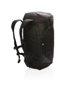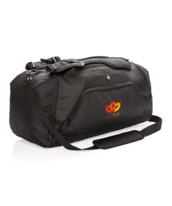 Lightweight 1680D and 600D polyester 2-in-1 bag. Works as both a backpack & duffle. Includes a roomy main compartment with a U-shaped top zipper closure, a side entry shoe or dirty clothes compartment and a side zippered pocket. The back with a bottle holder pocket and quick access pocket. Front zippered pocket with 2 RFID protected sleeves. Adjustable shoulder straps for carrying comfort and versatility. PVC Free.