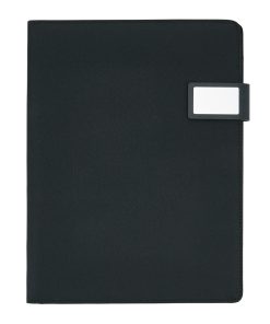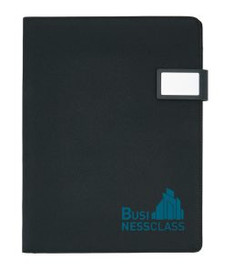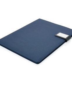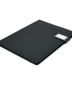 A4 tech portfolio with luxury magnetic metal closure. Inside: a tablet/phone stand, phone holder with see-through window which allows you to view and access your device. Suitable for most common phones. With sleeve for documents, 2 card holders and pen loop. Including recycled A4 notepad.