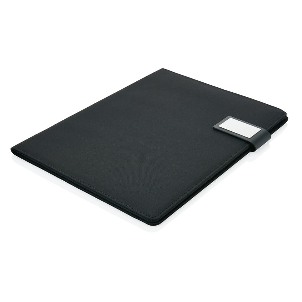A4 tech portfolio with luxury magnetic metal closure. Inside: a tablet/phone stand, phone holder with see-through window which allows you to view and access your device. Suitable for most common phones. With sleeve for documents, 2 card holders and pen loop. Including recycled A4 notepad.