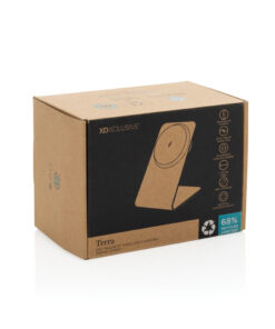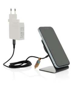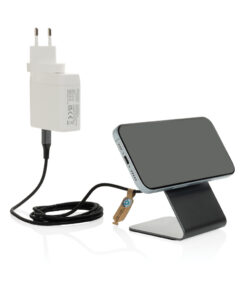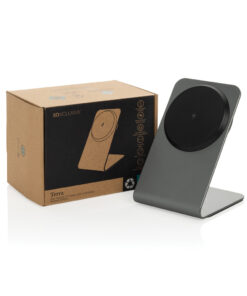 The Terra Aluminium 15W magnetic wireless charging phone stand redefines sophistication and performance. Delivering a powerful 15W output, its advanced magnetic system provides a secure hold for your device. With 15 precision magnets, it ensures flawless alignment for efficient charging, whether horizontal or vertical. The silicone base pads enhance stability, while the built-in charging indicator adds understated elegance. Made from RCS-certified recycled aluminum and ABS, the Terra stand combines refined design with a low impact. RCS (Recycled Claim Standard) verifies the recycled content throughout the supply chain. Made with 68% recycled content based on item weight. Completely PVC-free, it’s packaged in an FSC-certified kraft box, reinforcing its low-impact approach. The stand includes a 120 cm USB-C to USB-C cable, made from RCS-certified recycled TPE. Input USB-C: 9V/2.22A.