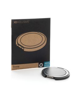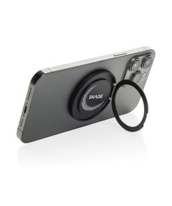 Magnetic phone holder with extra strong magnet. Compatible with all phones that come with an integrated magnet (iPhone 12 and higher) For Android compatible with phones that support QI2 other phones need a magnetic phone case. The aluminum ring can be folded out of make the phone into a stand (both horizontal and vertical) or as holder for holding your phone. Made with RCS (Recycled Claim Standard) certified recycled plastic and recycled aluminum. Total recycled content: 48 % based on total item weight. RCS certification ensures a completely certified supply chain of the recycled materials. Packed in FSC mix packaging.