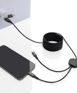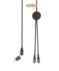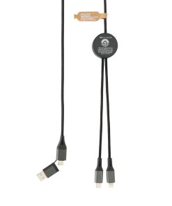 Extra-long 3 metre charging cable made with RCS (Recycled Claim Standard) certified recycled aluminium, recycled TPE, recycled ABS and recycled pet. Total recycled content: 53% based on total item weight. RCS certification ensures a completely certified supply chain of the recycled materials. Aluminium does not lose its characteristics in the recycling process and can be recycled endlessly. With dual input connector: USB A and type-C. Double output: Apple Lightning and Type C. Offering in total 4 charging options. With RCS certified braided recycled PET cable with a length of 300 cm. Packed in FSC® mix packaging. Suitable for charging only. Supports charging up to 5V/2A. 100% PVC free.
