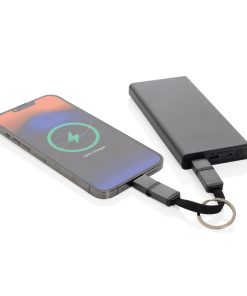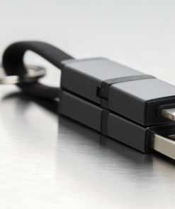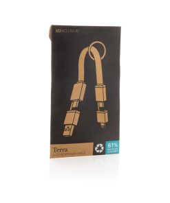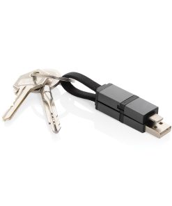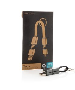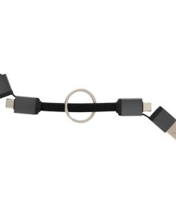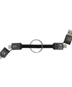 Fast charging 4-in-1 keychain cable made from RCS recycled TPE, recycled aluminium alloy and recycled PET. With USB A and type C input and IOS and Type C output it is suitable to charge many types of items. This small size cable supports a boosting 60W fast charge. Easy to attach to your keychain with included keychain ring. The connectors have magnets inside to keep them together while carrying them. Total recycled content: 60% based on total item weight. RCS certification ensures a completely certified supply chain of the recycled materials. Max supported current 20V/3A; Packed in plastic free envelope packaging. PVC free.