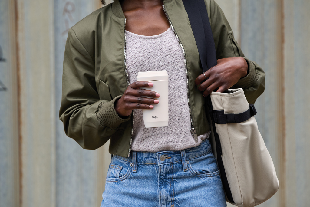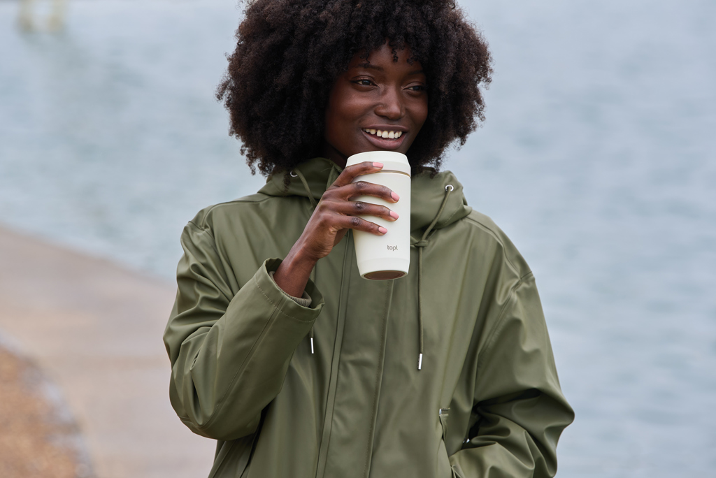 Meet the Topl Cup, your perfect fit for barista size 12oz (354ml) for your favorite tall brew. Made with RCS certified recycled materials and vacuum insulated, it keeps drinks at the perfect temperature. Its patented 360° sip design and transparent lid offer practicality and style for your daily adventures, whether you’re strolling the park or commuting to work. Made with 64% recycled material