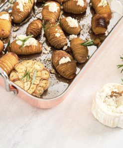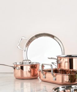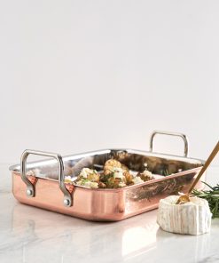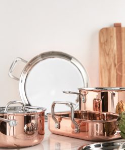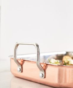 Exclusive tri-ply copper oven dish. The first layer is the copper exterior, the interior consists of a layer of aluminium and a layer of stainless steel, which make it easy to clean. The copper and aluminium layers conduct heat well, allowing the pot to heat up quickly and evenly.