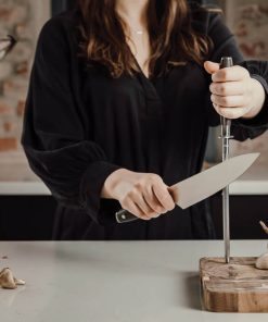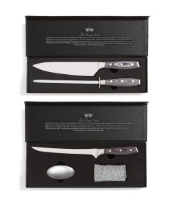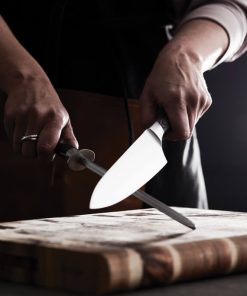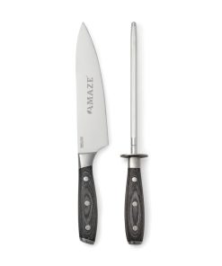 Chef’s knife and honing steel from the Kaiser range. The knife is crafted from X50CrMoV15 German steel and the handle made of Pakkawood. The easy-grip handle and superb balance in the blade makes the knife comfortable and easy to work with. The inherent properties of the German steel make the blade stain resistant and requiring no more care than occasional sharpening. Chef’s knife: 20 cm blade. Honing steel: 33 cm.