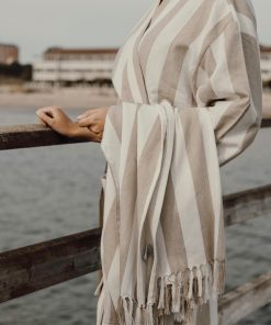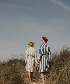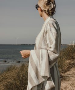 Bring this soft and comfortable hammam robe to the beach or simply enjoy it at home. Crafted from a lightweight and airy 200 gsm blend, it combines the comfort of cotton with the quick-drying benefits of polyester. Designed in a classic style with a two-tone striped pattern, it features a neat collar, front pockets, 3/4 sleeves, and a waist belt for a perfect fit. Certified by GRS (Global Recycled Standard), GRS certification guarantees that the entire supply chain of the recycled materials is certified. The total recycled content is based on the overall product weight. This product contains 69% GRS certified recycled cotton and 29% GRS certified recycled polyester.