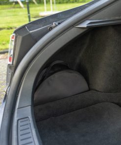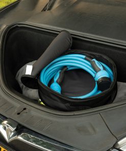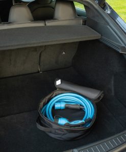 Premium charging cable bag that is suitable for all EV charging cables and is used to store your charging cable so the electric vehicle interior stays clean. The bag can store cables up to 7.5 metres and weight up to 5kg. Made with extra strong 1200D recycled PET embedded with the AWARE™ tracer. 2% of proceeds of each Aware™ product sold will be donated to Water.org. PVC free.The bag has a diameter of 38cm