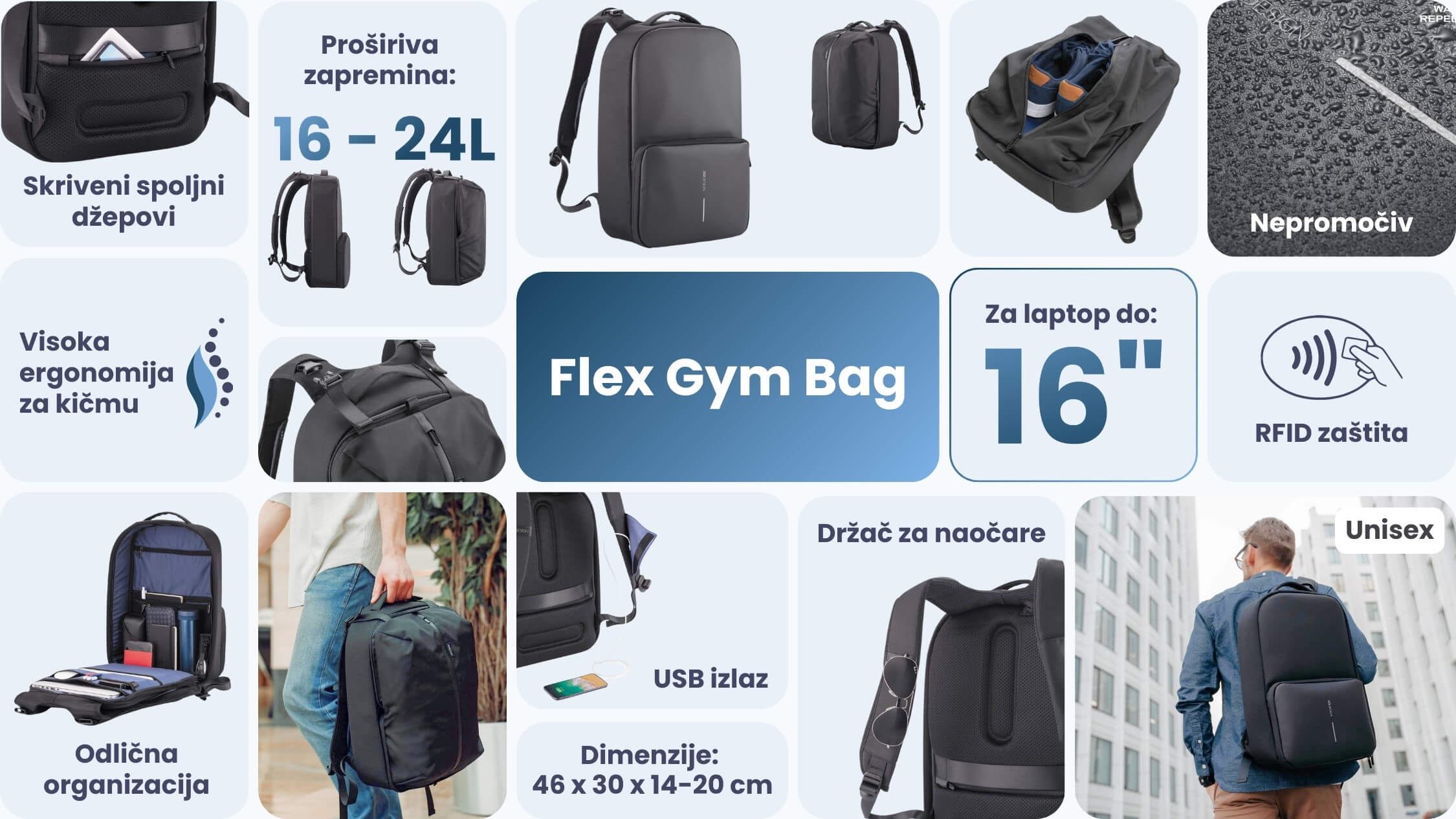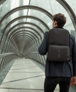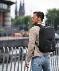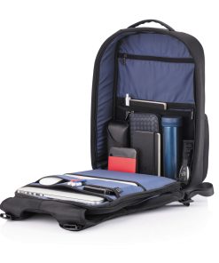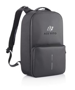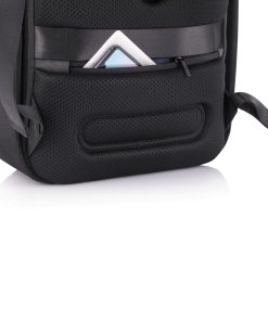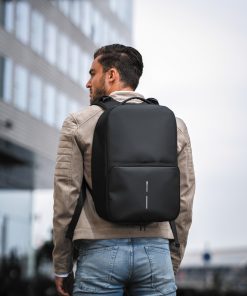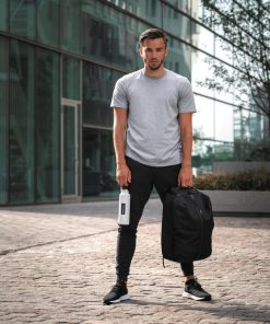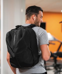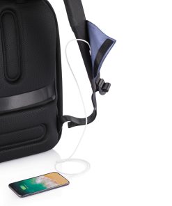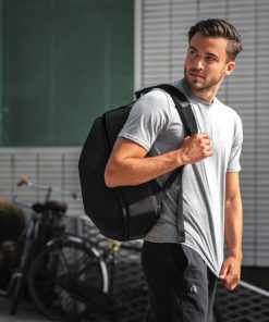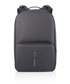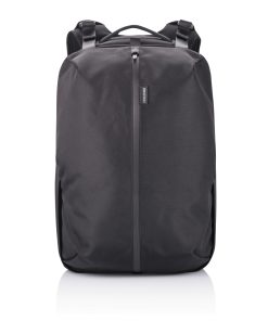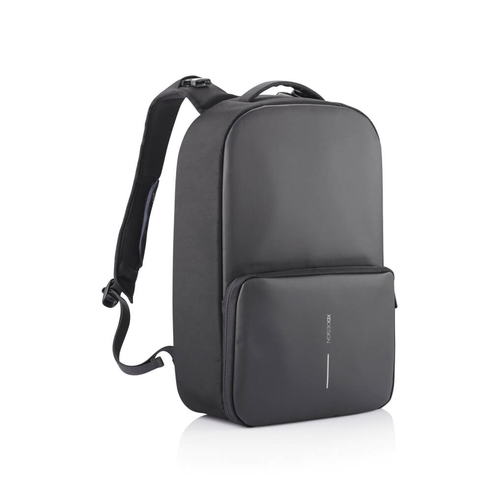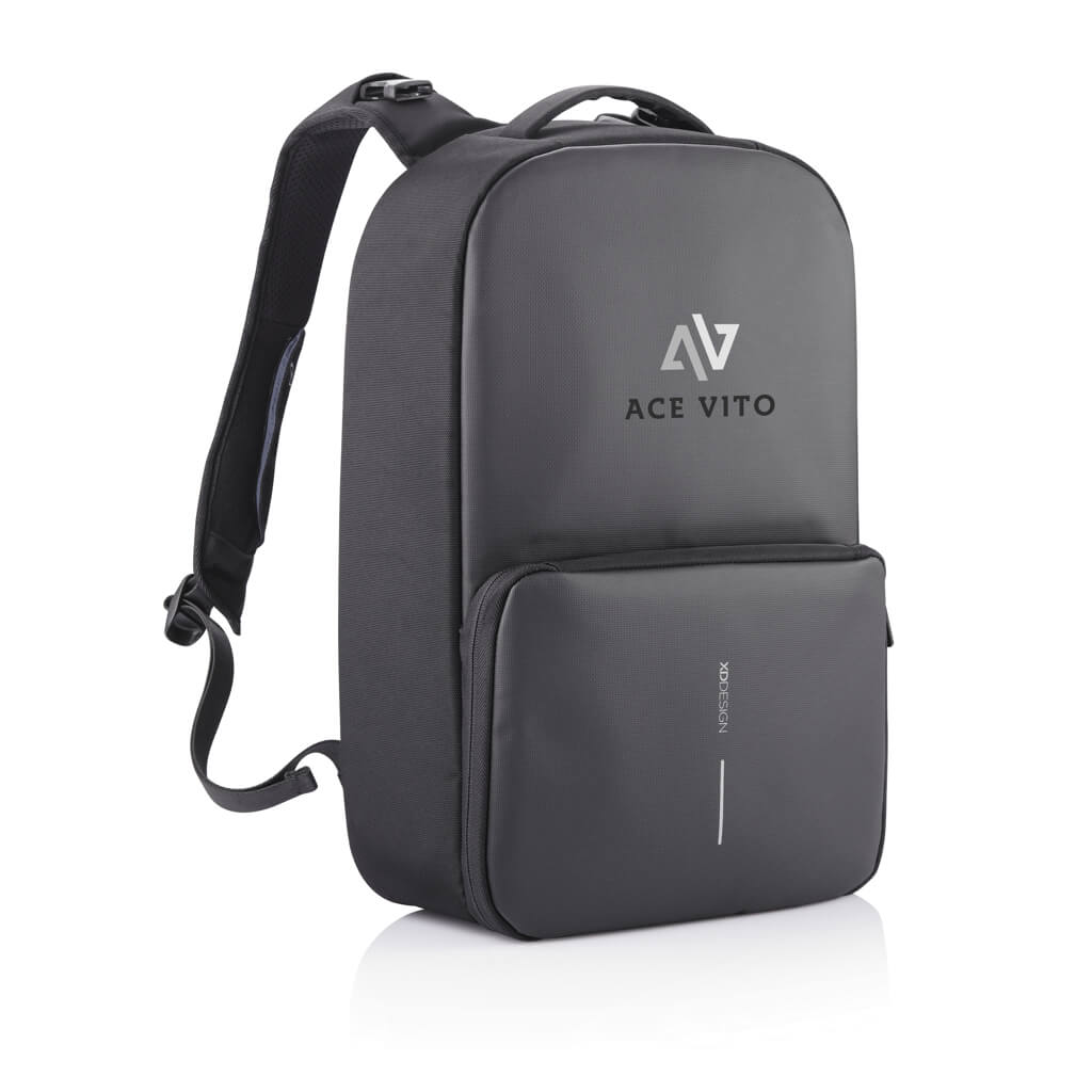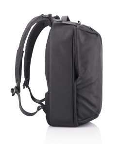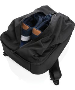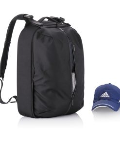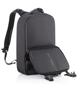 Flexible and practical, the XD Design Flex Gym bag is the first business backpack and gym bag all in one. Quickly convert this backpack from business to gym style, just expanding the front pocket, from 16 to 24 Litres.The anti-theft design with no front access and hidden zippers in the main compartment will ensure that you carry your professional devices securely. With the RFID protected pocket on the back you can safely store your wallet, cell phone or credit cards. Additionally, this backpack keeps you powered with a fast USB charging port on the shoulder strap where you can also find a sunglasses holder. Made from RPET materials with AWARE™ technology – using 53 recycled water bottles that would end up in landfill or oceans and saving 31 litres of water during the production process. The perfect backpack whether you are on your way to work, university or the gym. Registered design®